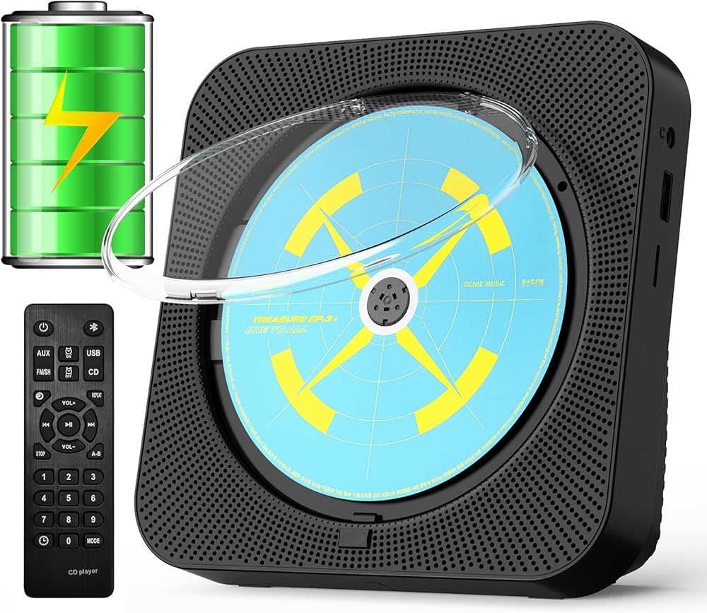 مشغل أقراص مضغوطة بلوتوث محمول، مشغل أقراص مضغوطة لسطح المكتب قابل لإعادة الشحن للمنزل مع مكبرات صوت هاي فاي، جهاز تحكم عن بعد، يدعم راديو CD/FM/USB/AUX/مؤقت (أسود)