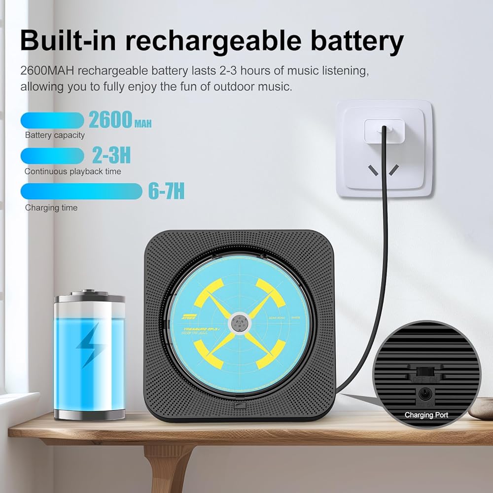 • 【مشغل أقراص مضغوطة قابل لإعادة الشحن】بطارية مدمجة بقوة 2600 مللي أمبير في الساعة، ليست هناك حاجة لاستخدام بطاريات AA أو توصيل كابل الشحن دائمًا بمشغل الأقراص المضغوطة المنزلي عند تشغيل الموسيقى. يمكن شحن مشغل الأقراص المضغوطة بالكامل خلال 6 ساعات تقريبًا. من المريح جدًا اصطحاب مشغل الأقراص المضغوطة القابل لإعادة الشحن هذا عند الخروج والاستمتاع بالموسيقى في أي وقت وفي أي مكان