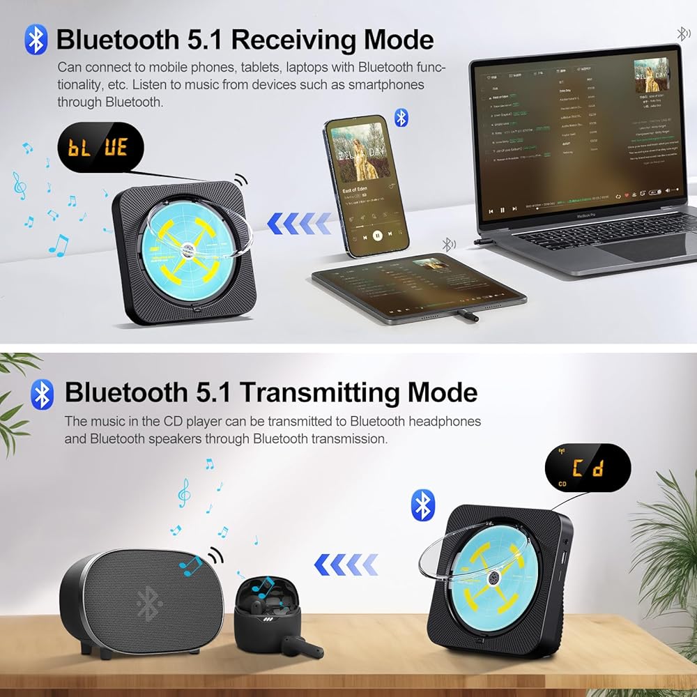 • 【بلوتوث 5.1】يحتوي مشغل الأقراص المضغوطة المحمول على جهاز إرسال واستقبال بلوتوث مدمج، ويمكنه الاتصال بسهولة بالأجهزة المسلحة بوظيفة البلوتوث مثل الهواتف وأجهزة الكمبيوتر والوسادات وما إلى ذلك، ويمكن أيضًا إقرانه مع سماعات الأذن أو مكبرات الصوت التي تعمل بتقنية البلوتوث
