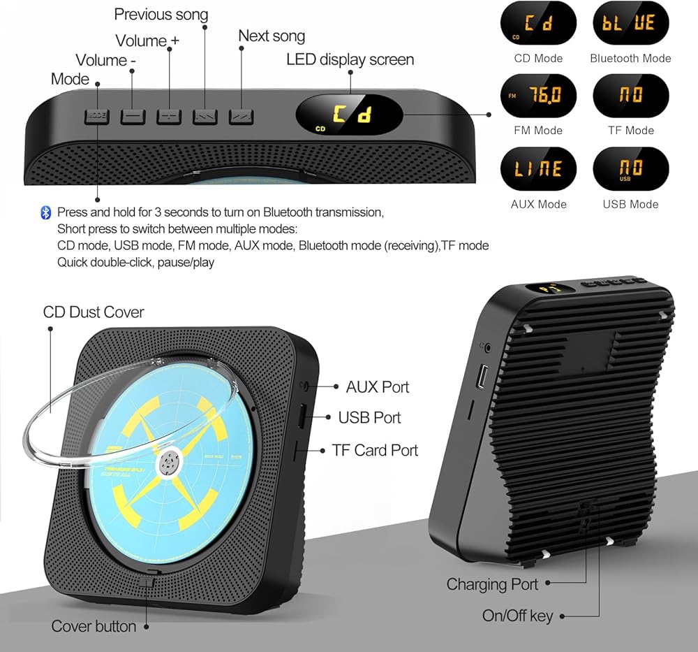 • 【مشغل أقراص مضغوطة متعدد الوظائف】مشغل أقراص مضغوطة بالإضافة إلى تشغيل أقراص CD، يدعم CD، CD-R، CD-RW، CD-MP3، CD-WMA. يمكنه تشغيل الصوت من أقراص فلاش USB وبطاقة TF، ويمكن تشغيله أيضًا عبر AUX 3.5 ملم. راديو FM، ساعة منبه، مع جهاز تحكم عن بعد، شاشة LED