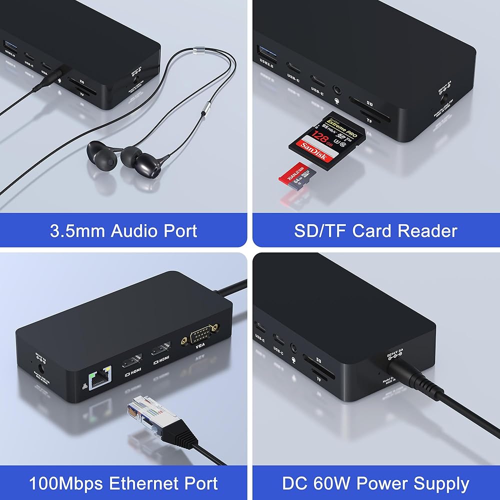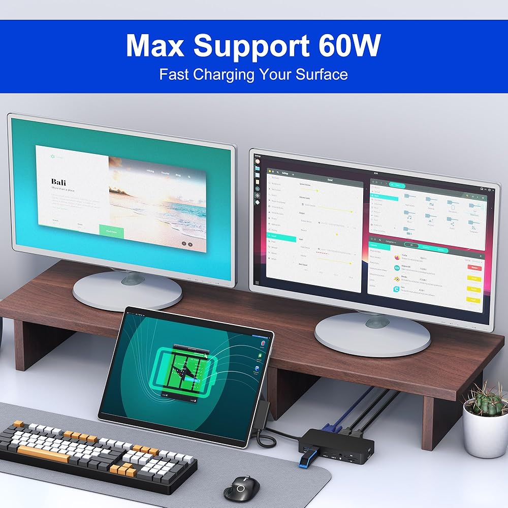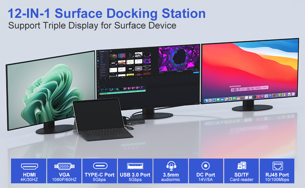 قاعدة شحن Microsoft Surface مع شاشات ثلاثية مزدوجة HDMI+VGA، قاعدة تركيب سطحية 12 في 1 لأجهزة Surface Pro 11/10/9/8/X/7/6/5/4/3، وSurface Laptop 5/4/3/2/ 1، سيرفس لاب توب جو 3/2/1، سيرفس بوك 3/2/1