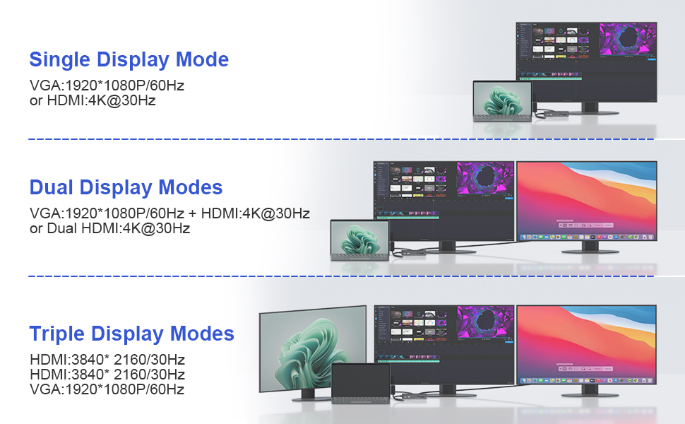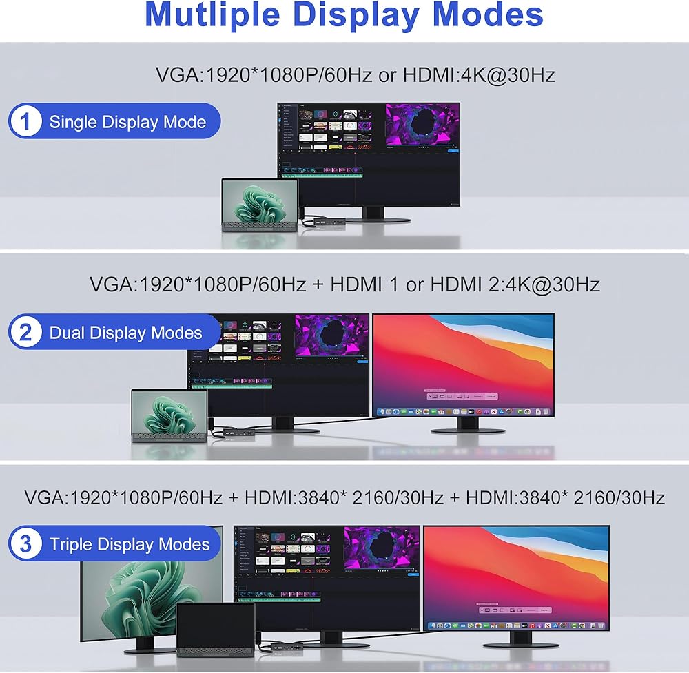قاعدة إرساء سطحية ثلاثية العرض مع مخرج Ultra HD 4K: تتميز بشاشات Surface ثلاثية (HDMI+HDMI+VGA) مع وضع ممتد أو مرآة، تعمل قاعدة إرساء Microsoft Surface هذه على تعزيز كفاءتك من خلال توفير مساحة العرض ثلاث مرات. توفر منصة Microsoft Surface منافذ HDMI وVGA ممتازة بدقة 4K، مع دعم 4K HDMI لدقة تصل إلى 3840 × 2160 عند 30 هرتز ومنفذ VGA يدعم دقة العرض حتى 1920 × 1080 عند 60 هرتز. *ملاحظة: عند توصيل جهاز Surface الخاص بك بما يصل إلى 3 شاشات إضافية للحصول على ثلاث شاشات (HDMI/HDMI/VGA + Surface)، ستحتاج إلى إيقاف تشغيل شاشة Surface