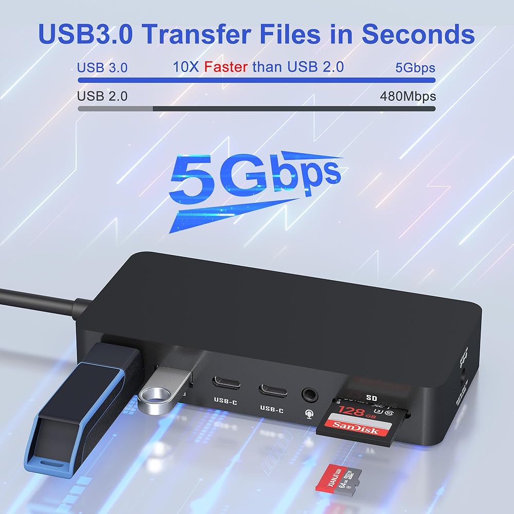 محطة إرساء سطحية لنقل البيانات فائقة السرعة: محطة إرساء Microsoft Surface Pro هذه مجهزة بمنفذين USB A 3.0 (5 جيجابت في الثانية) ومنفذين بيانات USB C (5 جيجابت في الثانية)، تمكنك قاعدة الإرساء هذه من توصيل لوحة المفاتيح والفأرة وفلاش USB بسهولة محرك الأقراص والأقراص الصلبة USB C والمزيد. بالإضافة إلى ذلك، تسمح لك منافذ SD TF الإضافية بقراءة أو تنزيل الصور ومقاطع الفيديو من الكاميرا بسرعة تصل إلى 104 ميجابايت/ثانية. استمتع براحة معززة وكفاءة موفرة للوقت مع قاعدة الشحن هذه من Microsoft
