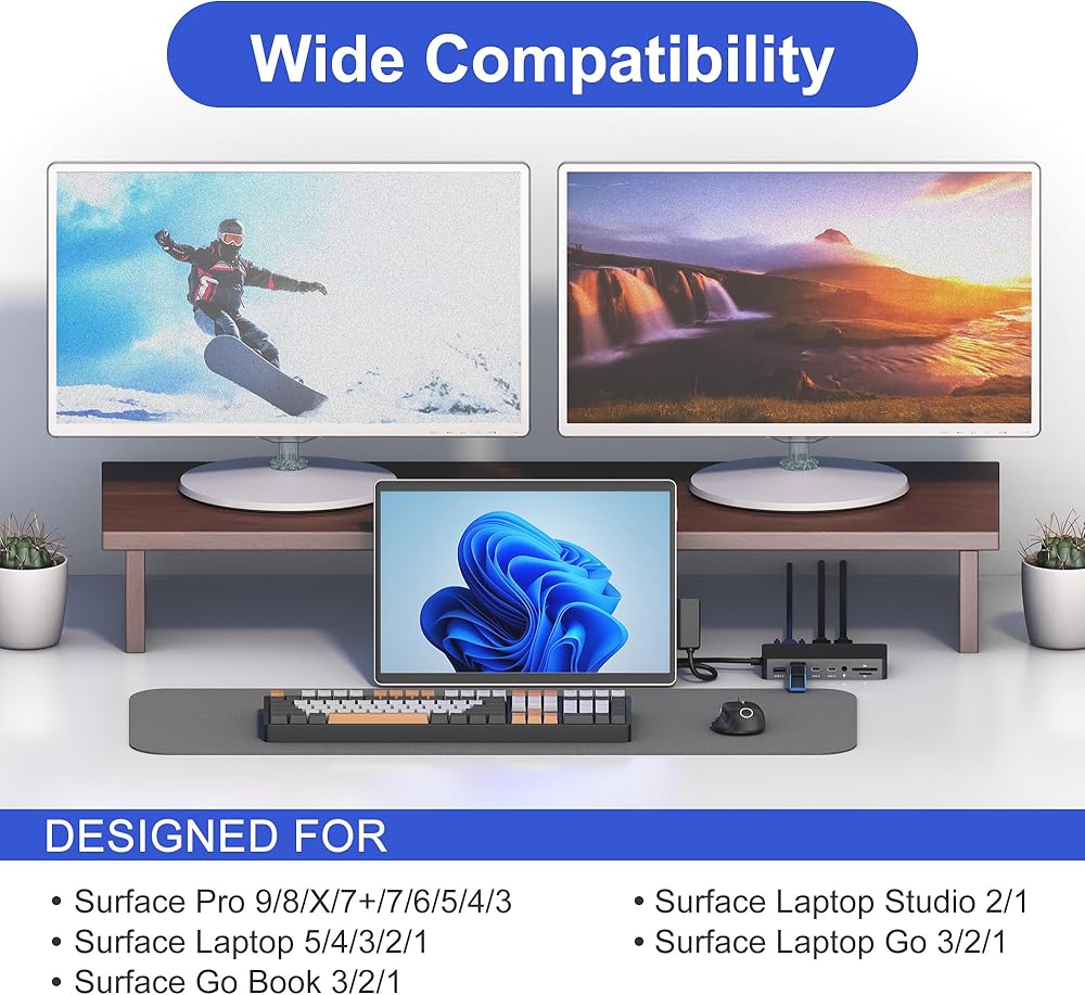 توافق واسع النطاق مع Surface Dock: تتميز قاعدة إرساء Microsoft Surface Pro بتقنية Surface Connection، وتوفر توافقًا شاملاً مع مجموعة من أجهزة Microsoft بما في ذلك Microsoft Surface Pro 11/10/9/8/X/7/6/5/4/2017، Microsoft Surface Laptop 5/4/3/2/1، وMicrosoft Surface Laptop Go 3/2/1، وMicrosoft Surface Laptop Studio 2/1، وMicrosoft Surface Book 3/2/1. (تأكد من توصيل اتصال السطح المغناطيسي بشكل صحيح بجهاز السطح الخاص بك وقم بتوصيل منفذ مصدر الطاقة عند الاستخدام.)