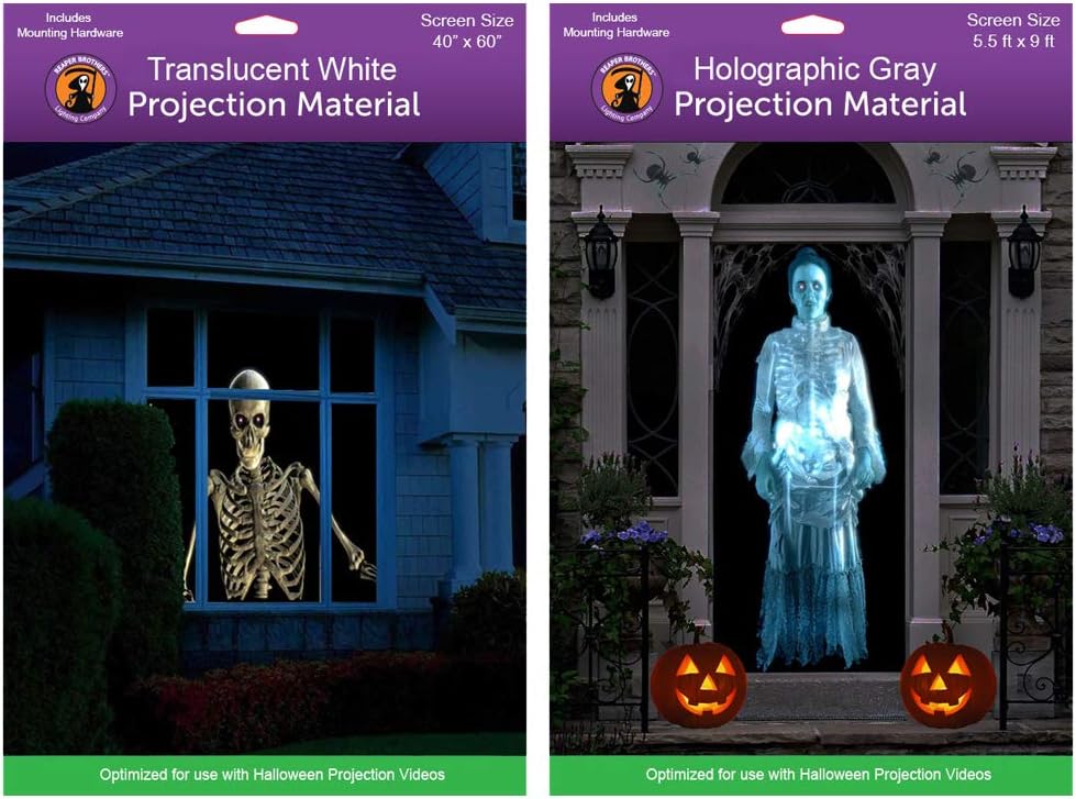 Qty 1 – Reaper Brothers Rear Projection Screen is formatted for your Window and is 40" tall & 60" wide and includes 3M mounting hardware. Creates a perfect 3D effect. Qty 1 – 5.5 ft x 9 ft Holographic Projection Material formatted for the doorways, windows or walls makes it easy to create mystifying “hologram-illusion” effects where ghosts and other characters appear to materialize from thin air. Hang this material in an open space and project a Hologram mode optimized Halloween Digital Decoration onto it, creating unforgettable (and mess-free!) celebrations – any time of year.