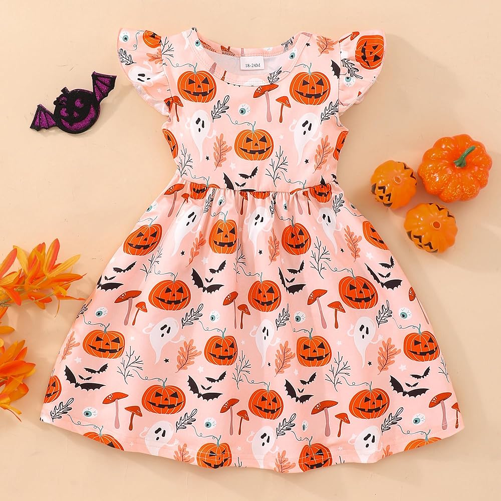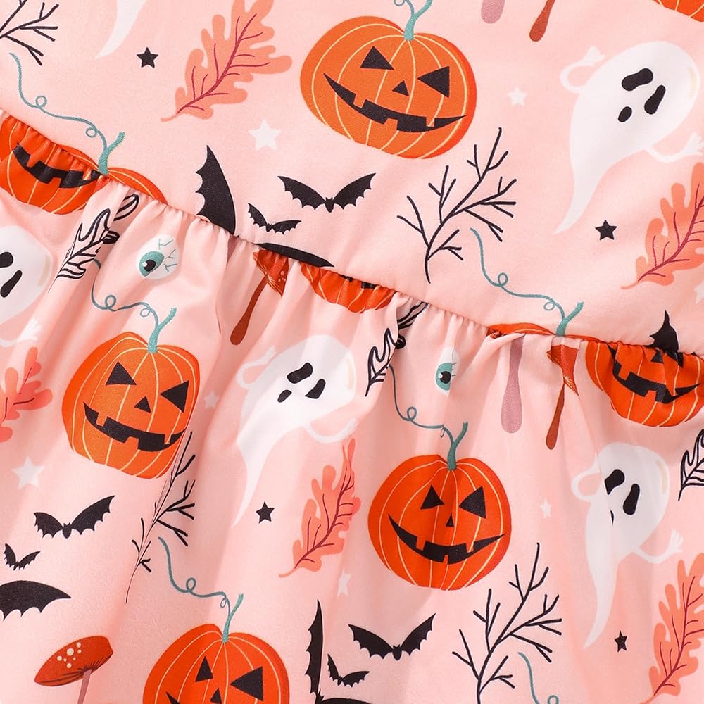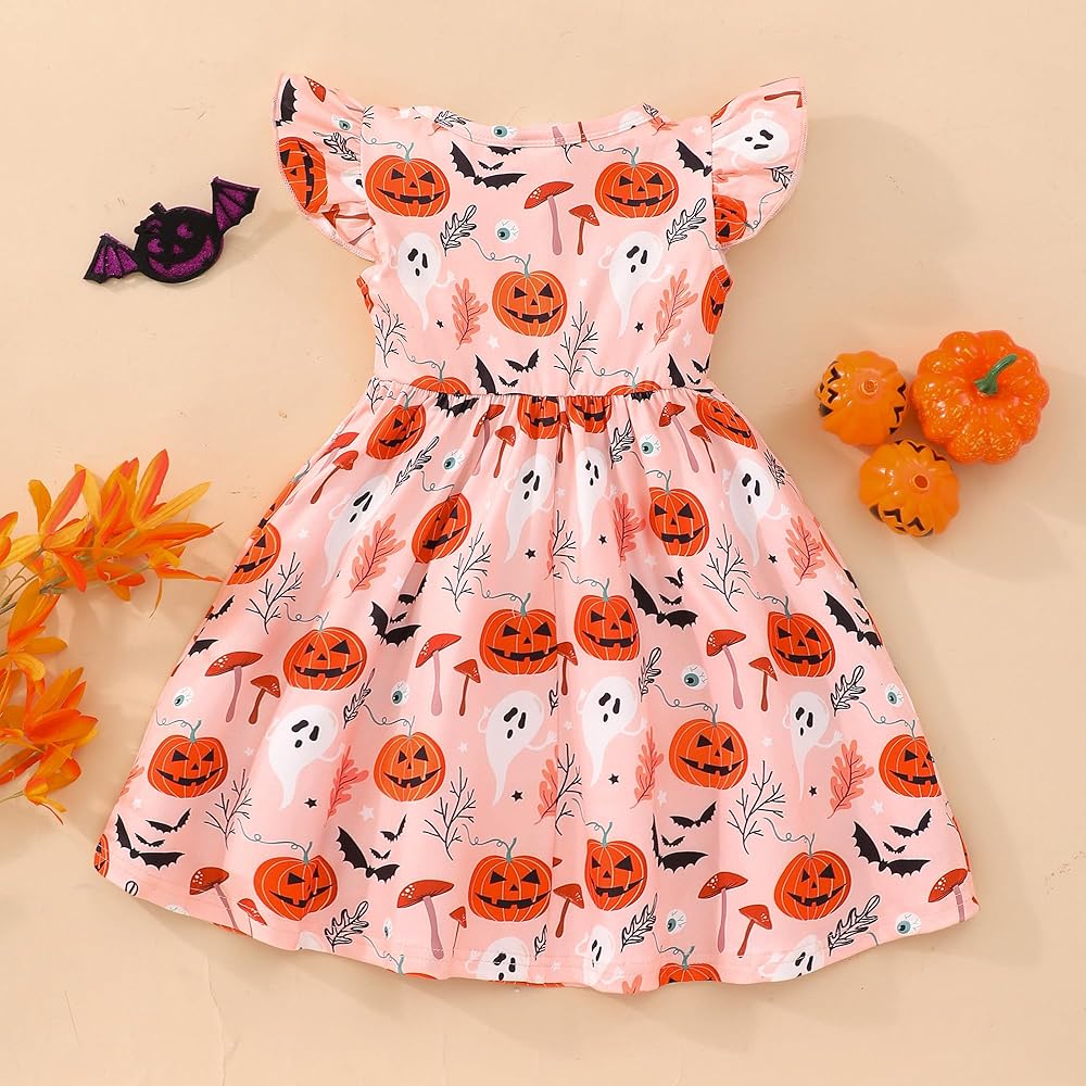 • فستان للفتيات الصغيرات في الهالوين: مطبوع على شكل قرع وهيكل عظمي لطيف، نمط وردي وأرجواني وأسود، فستان رائع للهالوين لطفلتك الصغيرة للاحتفال.