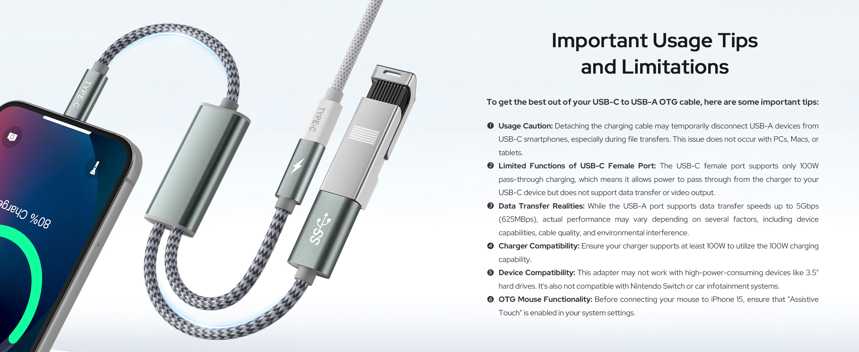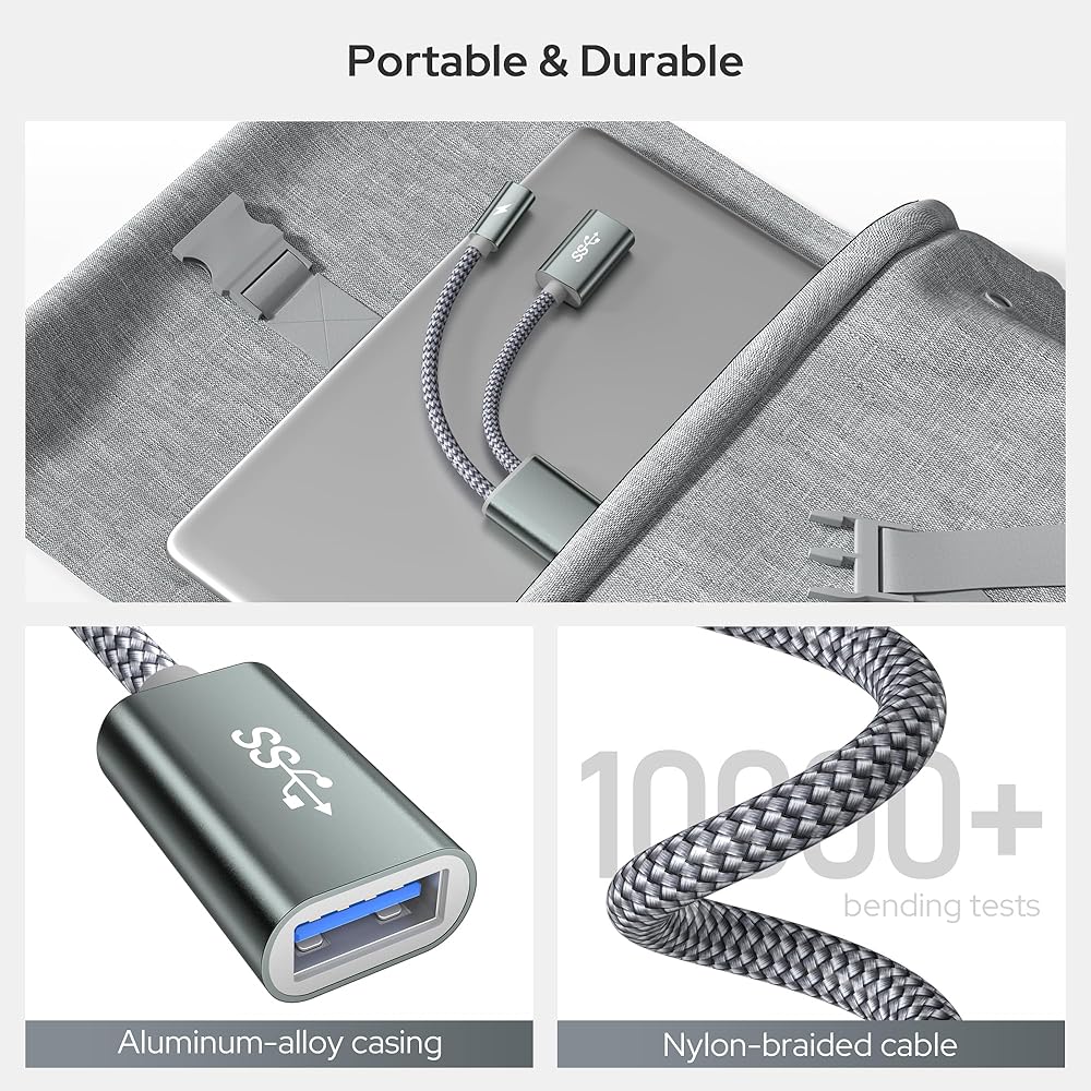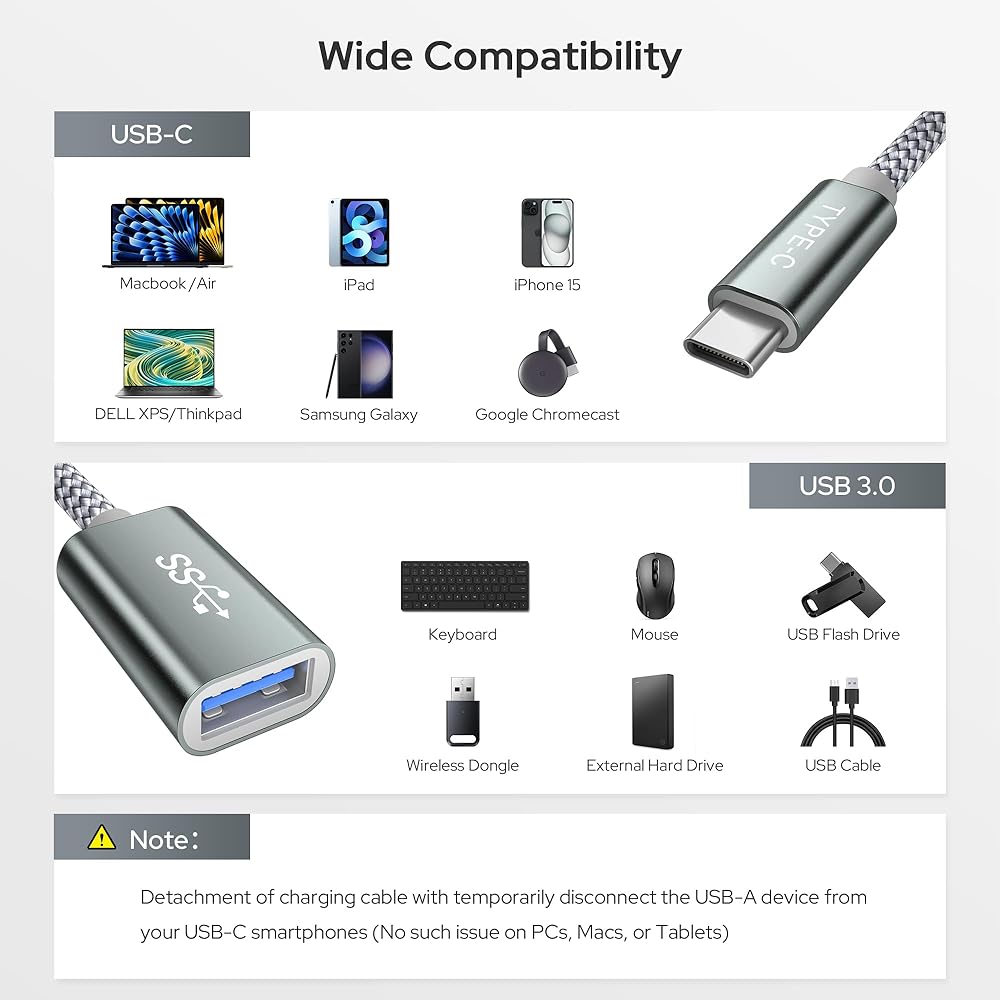 قم بتوصيل الأجهزة الطرفية USB-A بسهولة: قم بربط أجهزة USB-A الخاصة بك بسهولة بأدوات USB-C الجديدة الخاصة بك باستخدام كابل OTG متعدد الاستخدامات. استمتع بسرعات نقل بيانات فائقة السرعة تصل إلى 5 جيجابت في الثانية (625 ميجابت في الثانية) ومخرج قوي يصل إلى 15 وات من منفذ USB-A، وهو مثالي لتشغيل أجهزتك ومزامنتها.