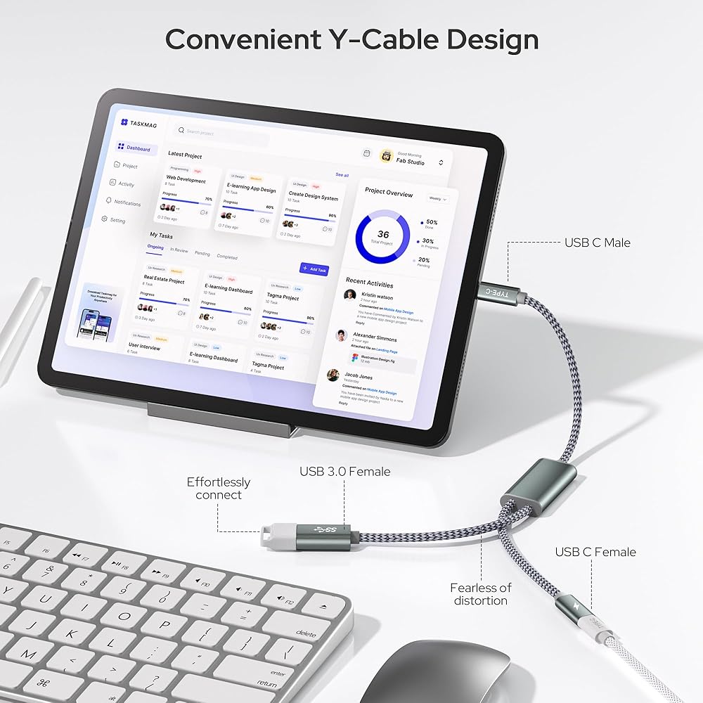 تصميم كابل Y مريح: تمتع بتجربة الراحة المطلقة مع كابل Y المصمم بعناية. على عكس المحولات التقليدية ذات النمط المحوري، يوفر هذا التصميم كابلين تمديد قصيرين لمنفذ USB-C الأنثوي ومنفذ USB-A الأنثوي، مما يجعل من السهل الوصول إلى اتصالاتك وإدارتها أثناء الاستخدام.