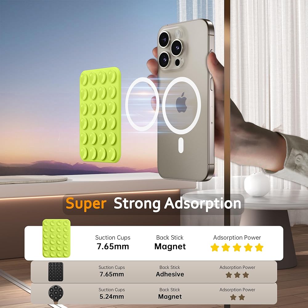 [Multi-scenario Application] Magnetic Suction Cup Phone Mount can stick your phone on any smooth surface to take pictures, such as vanity mirrors, glass windows, countertops, tiles, & even other phones or TVs! With its detachable design, easy snap-on & off functionality without adhesive residue.