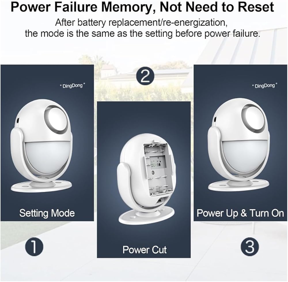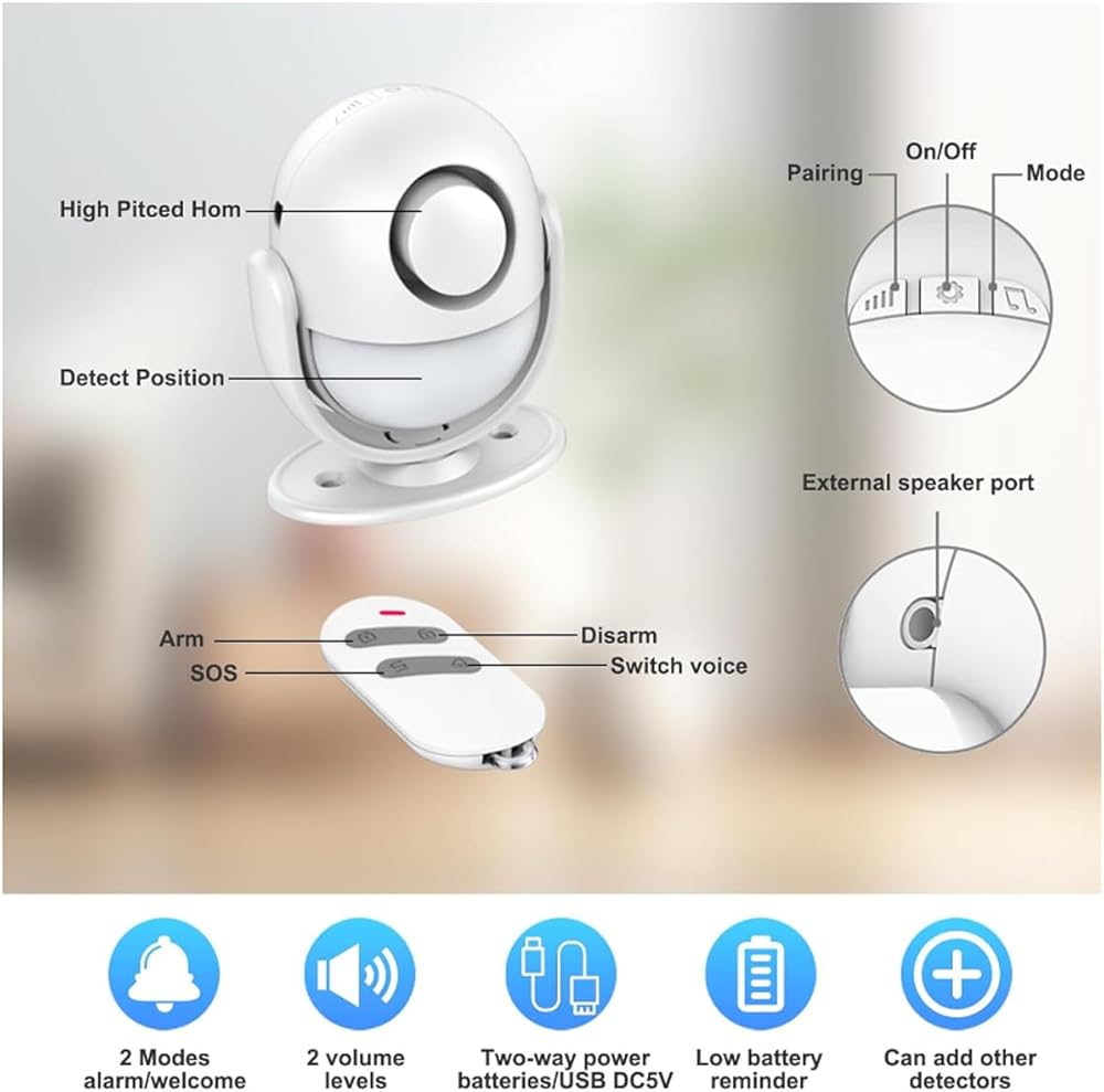 جهاز استشعار الحركة إنذار لاسلكي للكشف عن الحركة 125 ديسيبل بصوت عالٍ مع جهاز تحكم عن بعد بطول 328 قدمًا، إنذار نافذة داخلي وخارجي لتحية الباب / تنبيه الدخول / الفناء / رعاية المسنين