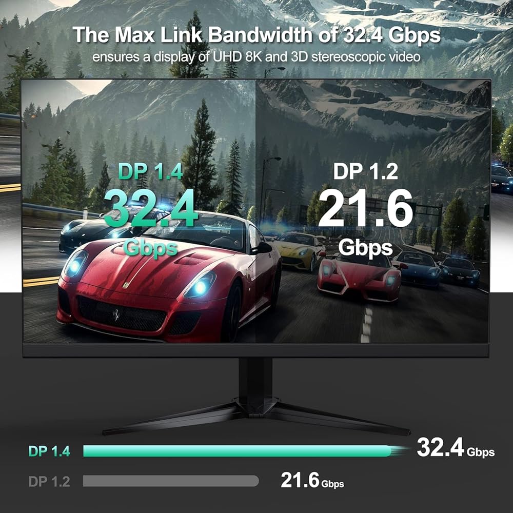 توافق واسع: يتم توصيل كابل DisplayPort إلى DisplayPort 1.4+ مباشرةً من سطح المكتب/الكمبيوتر المحمول المجهز بمنفذ DisplayPort إلى الشاشة. متوافق مع شاشات الألعاب Samsung وDell وLG وHP وASUS وAcer وAlienware. يدعم DP، DP++، وDisplayPort++.