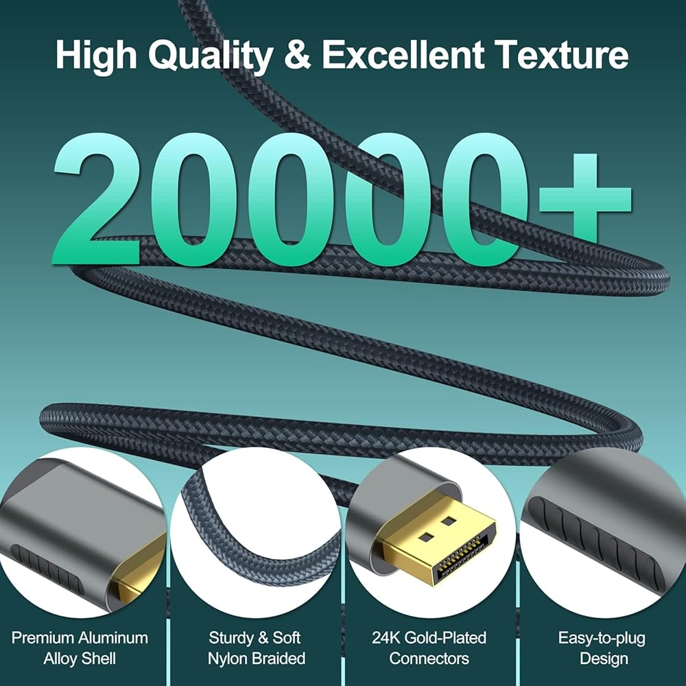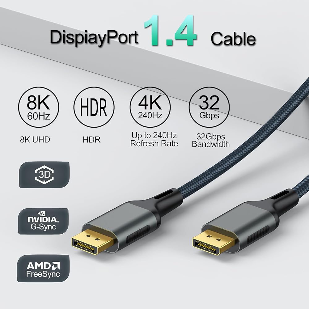 كابل DisplayPort 1.4 8K: كابل DisplayPort 1.4 [معتمد من VESA] يدعم الدقة العالية 8K(7680x4320)@60 هرتز، 5K(5120x2880)@60 هرتز، 4K(3840x2160)@60 هرتز/120 هرتز/144 هرتز، 2K@165 هرتز/144 هرتز، 1080P@240 هرتز. متوافق مع الإصدارات السابقة مع DisplayPort 1.3/1.2/1.1، وما إلى ذلك. وهو متوافق أيضًا مع FreeSync وG-Sync. (ليس DP إلى HDMI؛ وليس Mini Displayport)