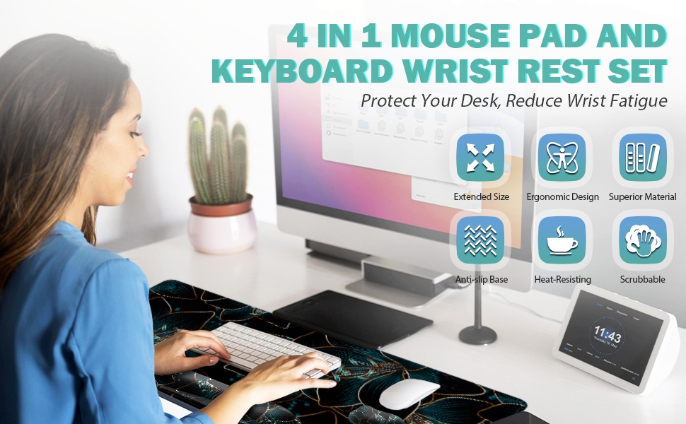 【سطح أملس ونمط حيوي】يسمح لك النسيج الناعم لواقي حصيرة المكتب هذا بتحريك الماوس بسهولة، ويوفر تحكمًا دقيقًا في الماوس وتشغيله أثناء العمل أو اللعبة، وهو متاح للفئران الميكانيكية واللاسلكية والبصرية. لوحة الماوس الممتدة ومسند المعصم للوحة المفاتيح باستخدام تقنية الطباعة المتقدمة تجعل لوحة الماوس ودعم المعصم يتميزان بأنماط واضحة ورائعة بألوان زاهية تجلب المرح والأناقة لحياتك.