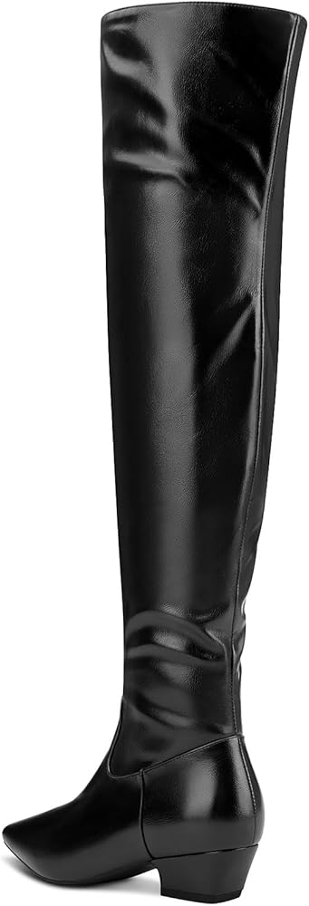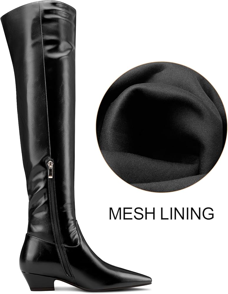 - ارفعي أناقتك مع هذه الأحذية النسائية ذات الكعب العالي المكتنزة والكعب المنخفض ومقدمة مدببة فوق الركبة. 👢✨