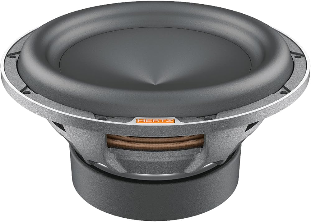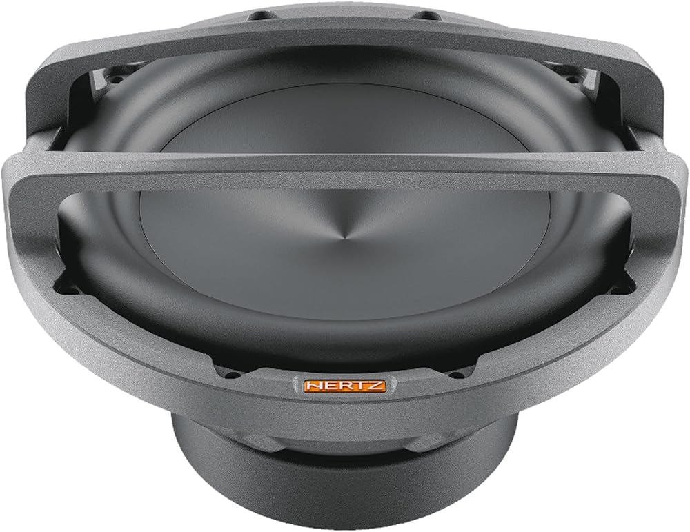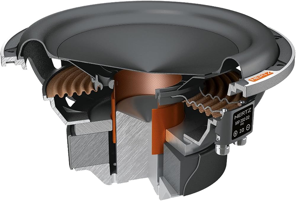 Outstanding performance in a compact size, this is the target of Mille Pro car audio subwoofers. On the strength of its know-how acquired with Mille Legend, the R&D team has optimized the production process to offer the “Hertz Sound Experience” to a wider audience using part of the technologies and materials of the flagship line. The MP 250 D2.3 cone is made by pressing paper pulp with the injection of mineral powders, the same construction technique used for Legend. The V-cone profile increases rigidity, allowing the cone to function like a piston. Surround materials consist of high-purity IIR-butyl rubber. Like the Legend ML2000.3 and ML2500.3, the Mille PRO subwoofers are built with Boundary Free Surround technology allowing for a greater emission surface with equal diameter, generating higher sound pressure. The compact 6-spoke aluminum alloy anti-resonant basket is the same as the top model ML 2500.3 and contributes to the subwoofer's mechanical damping, being absolutely transparent to the sound. Features - CNC machined elegant diamond-cut basket edge featuring the Hertz logo. Terminal block accepting cables up to 8 AWG to provide ultra-low wiring resistance in low impedance configurations. A plastic cover prevents any accidental short-circuit. Possibility to secure the subwoofer to the box wall, taking full advantage of its minimal dimensions. High performance compact motor with a superior magnetic field transferred to the coil. Specifications - Size mm (in.): 250 (10) Power Handling - Peak W: 1200 Power Handling - Continuous W: 600 Impedance Ω: 2+2 Sensitivity dB SPL: 83,5 Voice coil Ø mm (in.): 65 (2.56) Xmax mm: 17,00