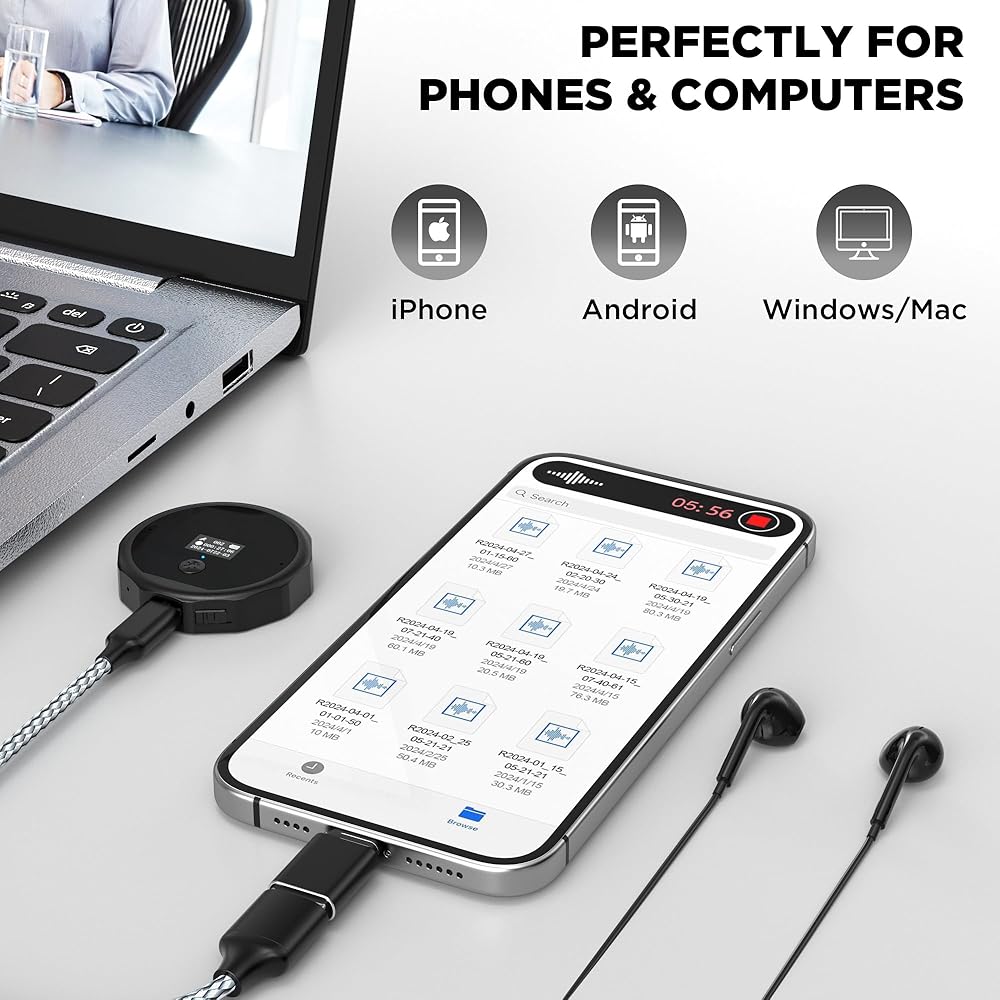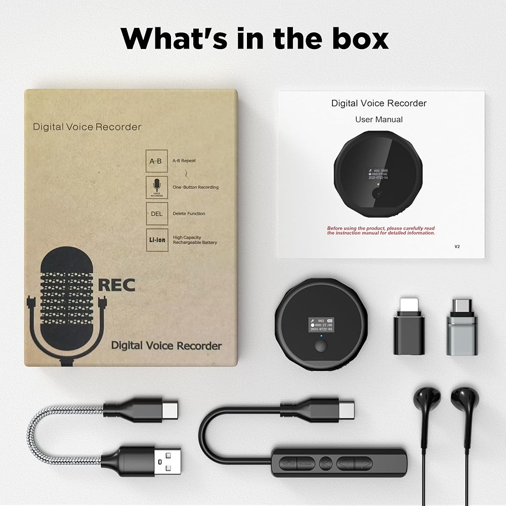What's in the Box: 1 digital voice recorder, 1 headphone, 1 Type-C cable, 2 OTG adapters, and 1 user manual. Note: The included headphones are required for listening to the recorded files.