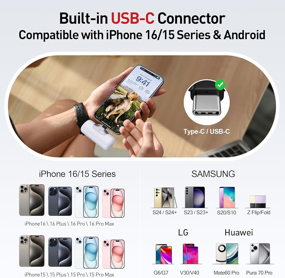 • توافق واسع: الشاحن المحمول iWALK عبارة عن موصل مدمج من النوع C، وهو متوافق مع iPhone 16/15، وiPhone 16/15 Plus، وiPhone 16/15 Pro، وiPhone 16/15 Pro Max، وiPad، وAirPods، ومصمم لـ هواتف Android، مثل Samsung Galaxy S24 وS23 وS22 وZ Flip6 وZ Fold6 وNote وOPPO وXiaomi وHuawei وPixel وLG وOneplus وما إلى ذلك.