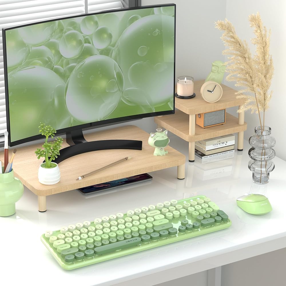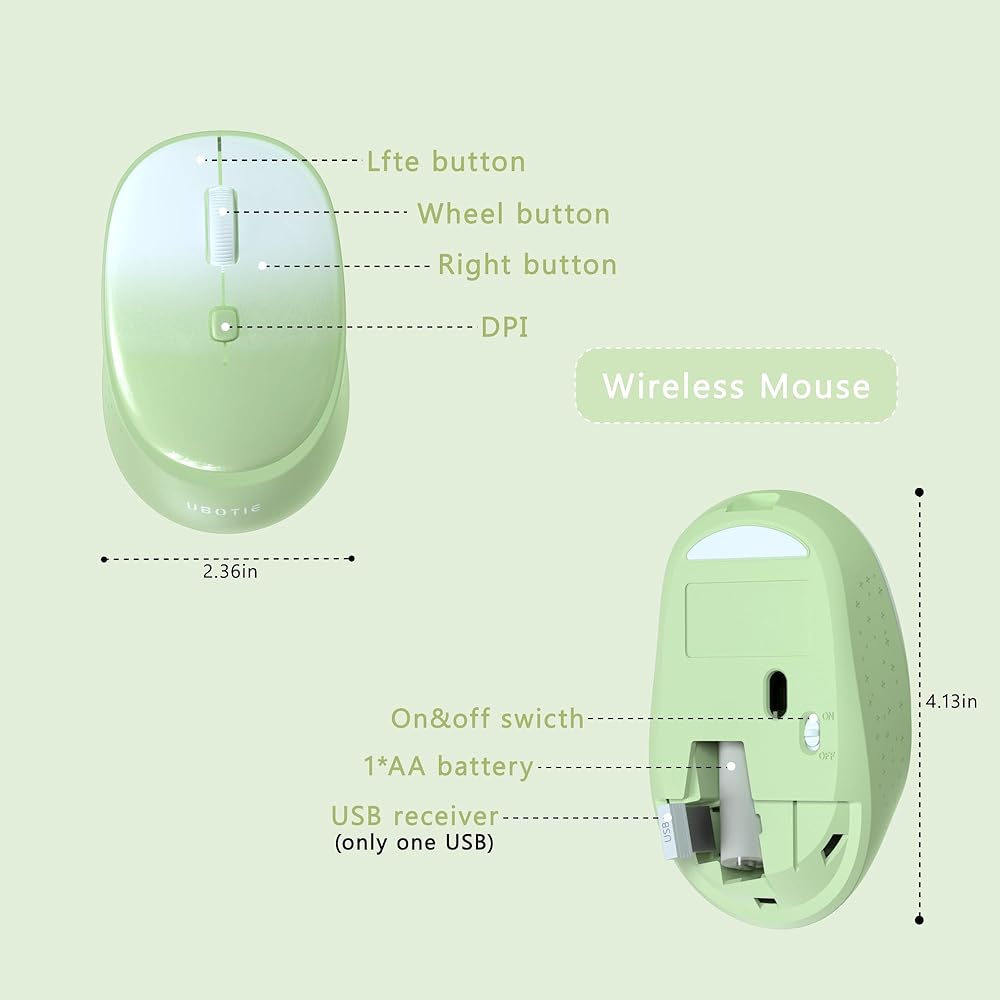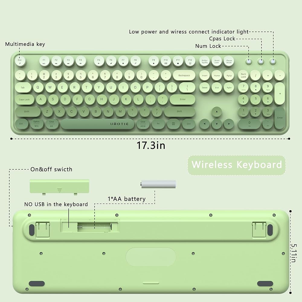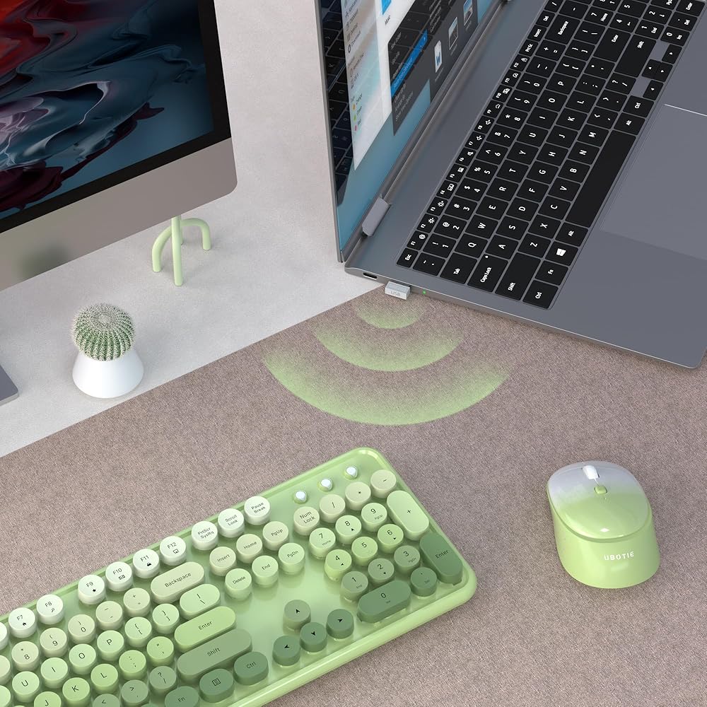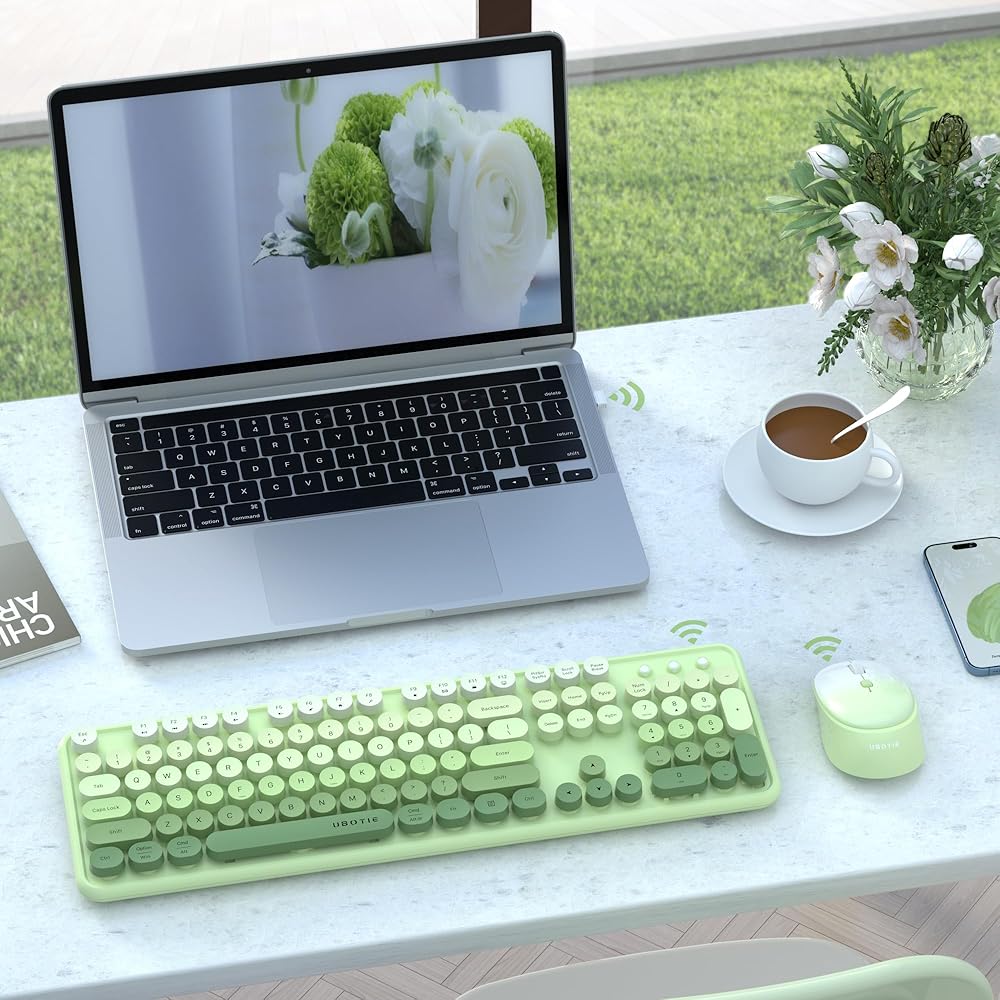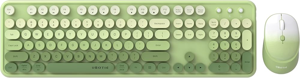 مجموعات ماوس لوحات المفاتيح اللاسلكية الملونة للكمبيوتر من UBOTIE، مفاتيح الآلة الكاتبة المرنة، لوحة مفاتيح كاملة الحجم للمكتب، اتصال خالٍ من التسرب بسرعة 2.4 جيجا هرتز وماوس بصري (متدرج أخضر)