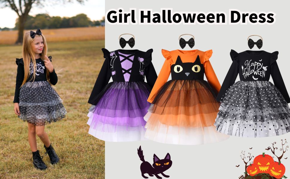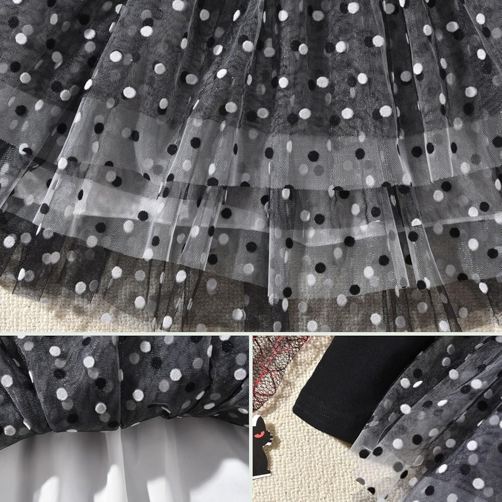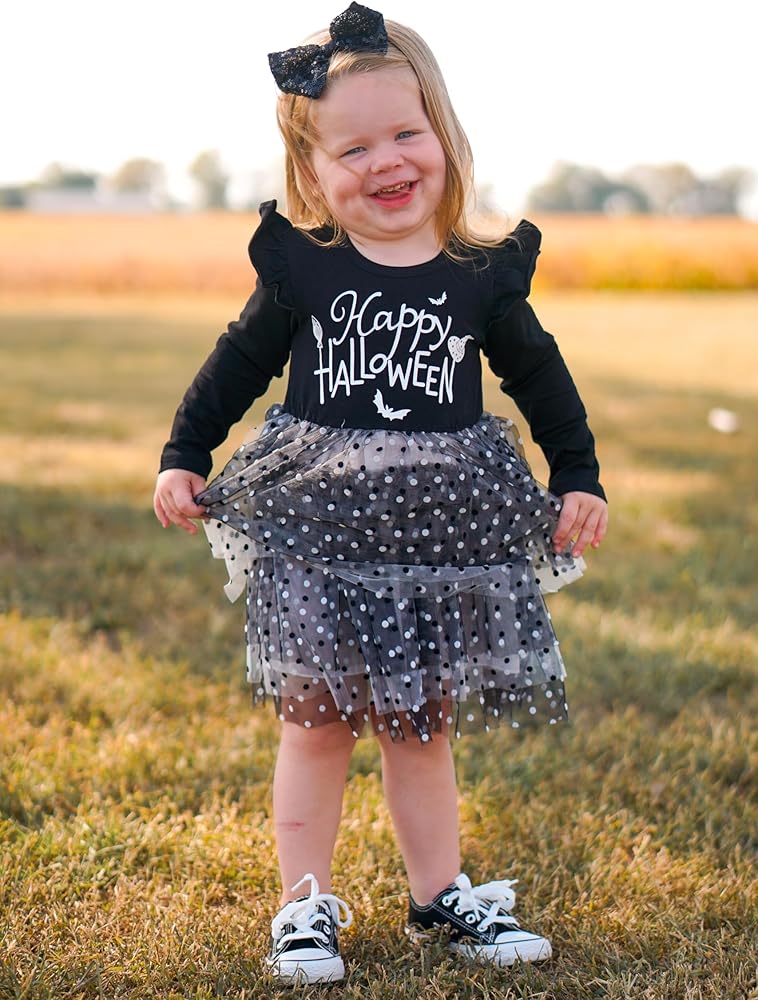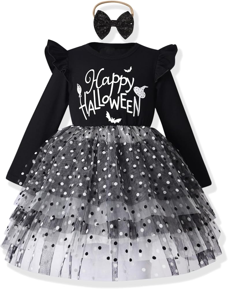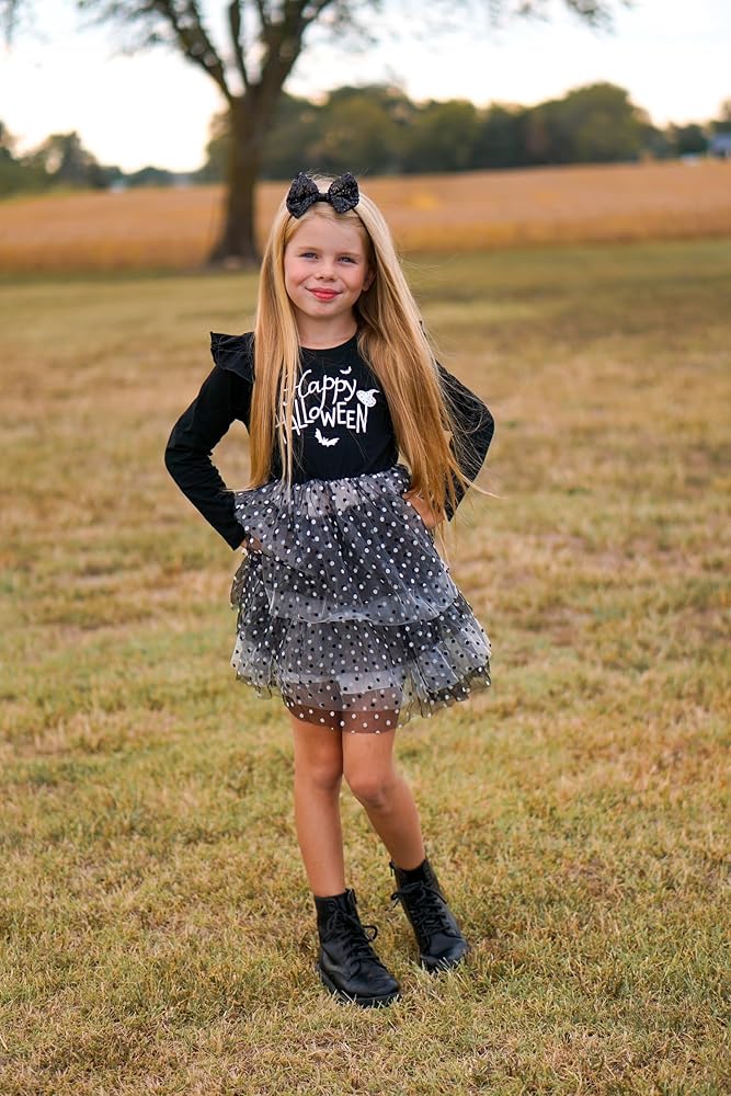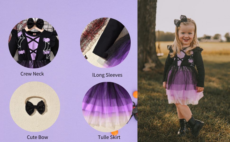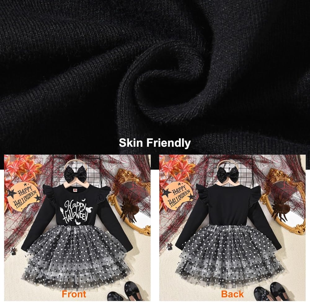 • 🎀تصميم فريد: تتميز ملابس الفتيات الصغيرات بجزء علوي مكشكش بأكمام طويلة وفستان من التول، مطبوع بنمط الهالوين الفريد. ستبدو طفلتك الصغيرة جذابة وملفتة للنظر أثناء ارتداء فستان توتو للفتيات الصغيرات.