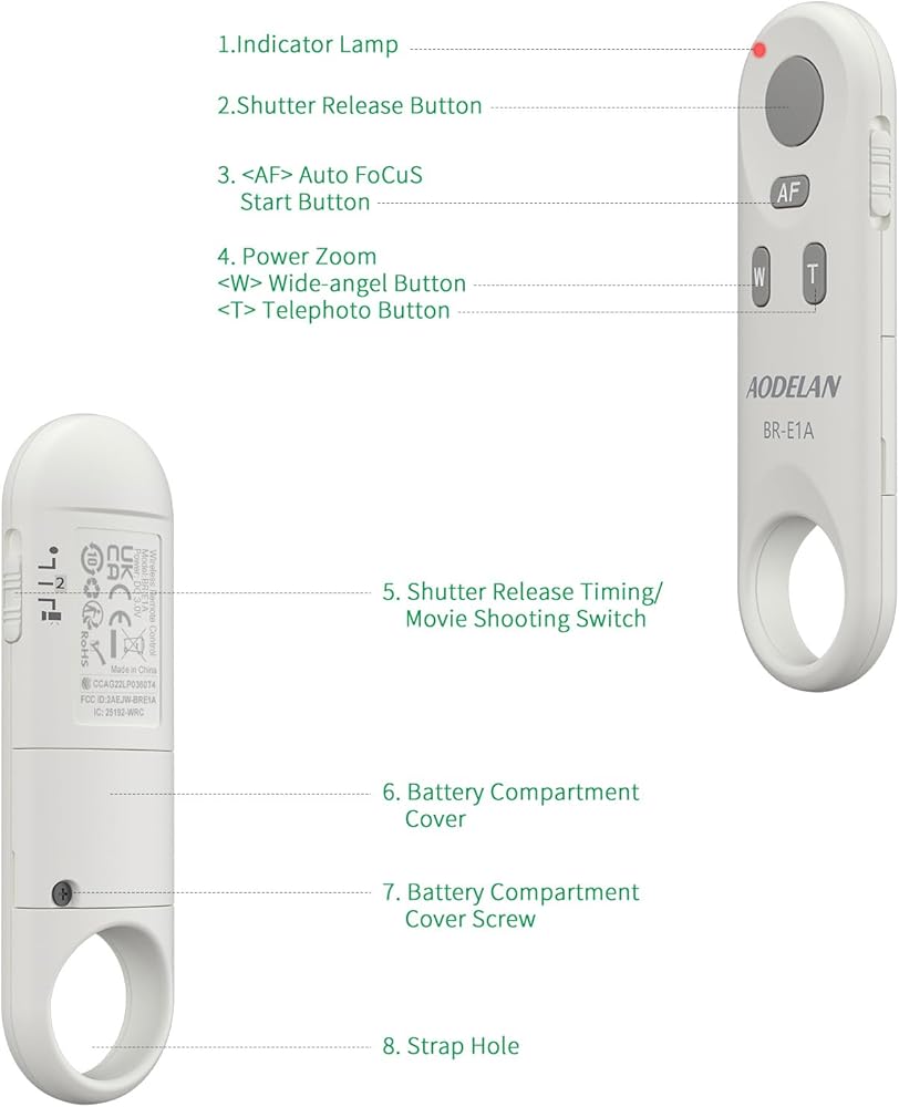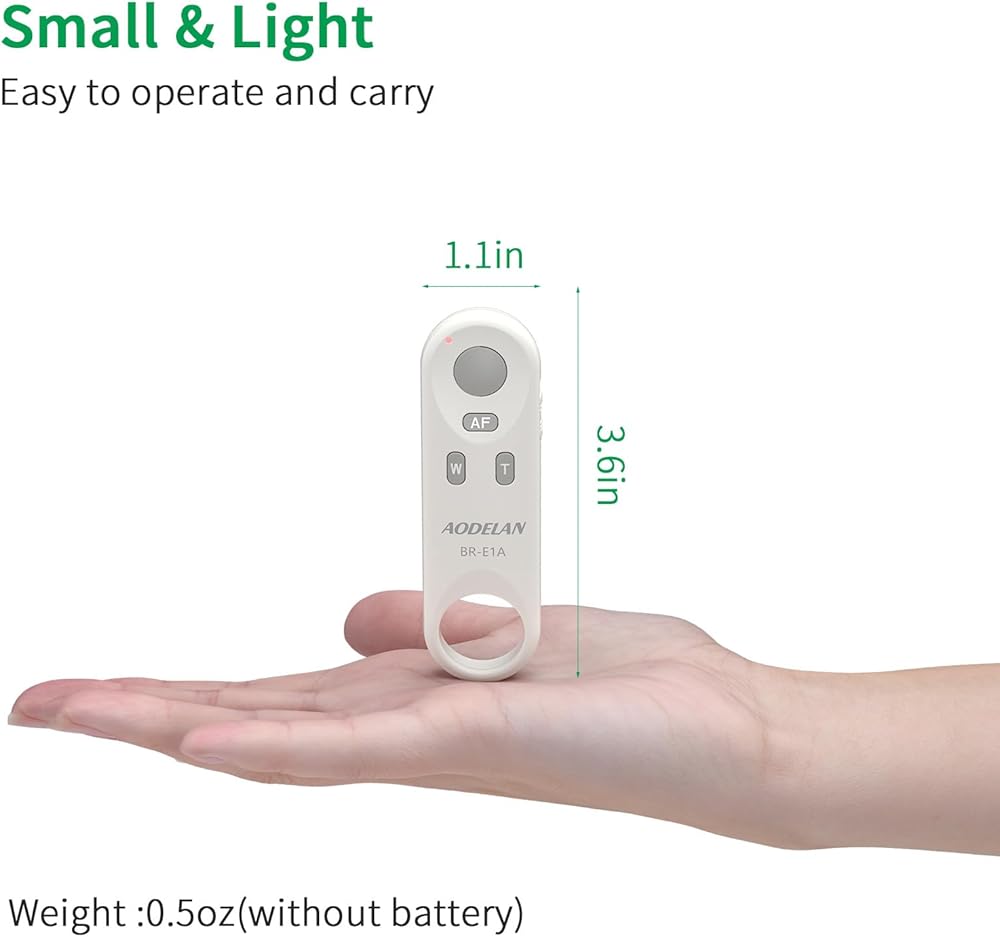 • سهل الاستخدام: صغير الحجم وخفيف الوزن وسهل الحمل. إعداد بسيط عن طريق ضبط الكاميرا على الوضع البعيد. (ملاحظة: جهاز التحكم عن بعد اللاسلكي AODELAN BR-E1A متوافق فقط مع طرازات الكاميرا المدرجة. تأكد من ضبط وضع محرك الكاميرا على "Remote" للحصول على الوظيفة المناسبة.)