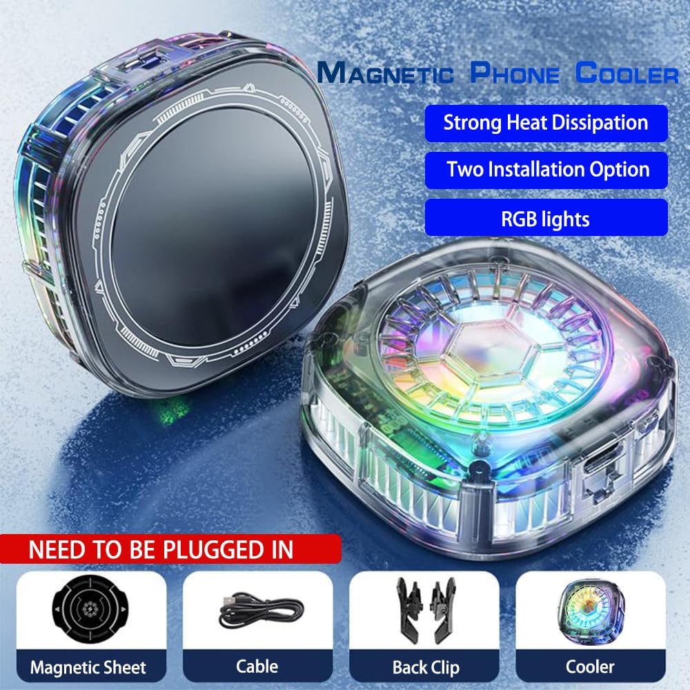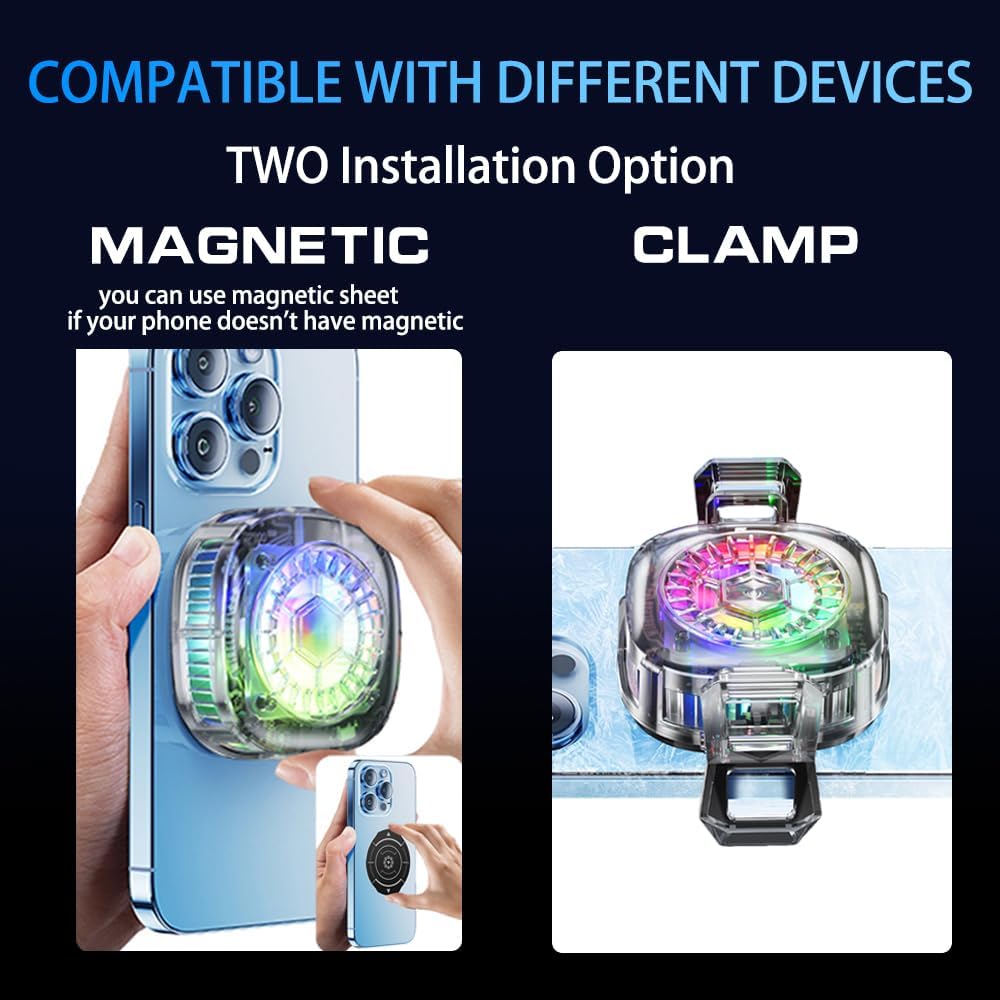 【توافق عالمي】: يوفر مبرد الهاتف هذا خيارين للتركيب - ملحق مغناطيسي وتثبيت بمشبك خلفي، مما يجعله مثاليًا لجميع أحجام الأجهزة. iPhone / Android phone/Switch/ iPad/Tablet إلخ