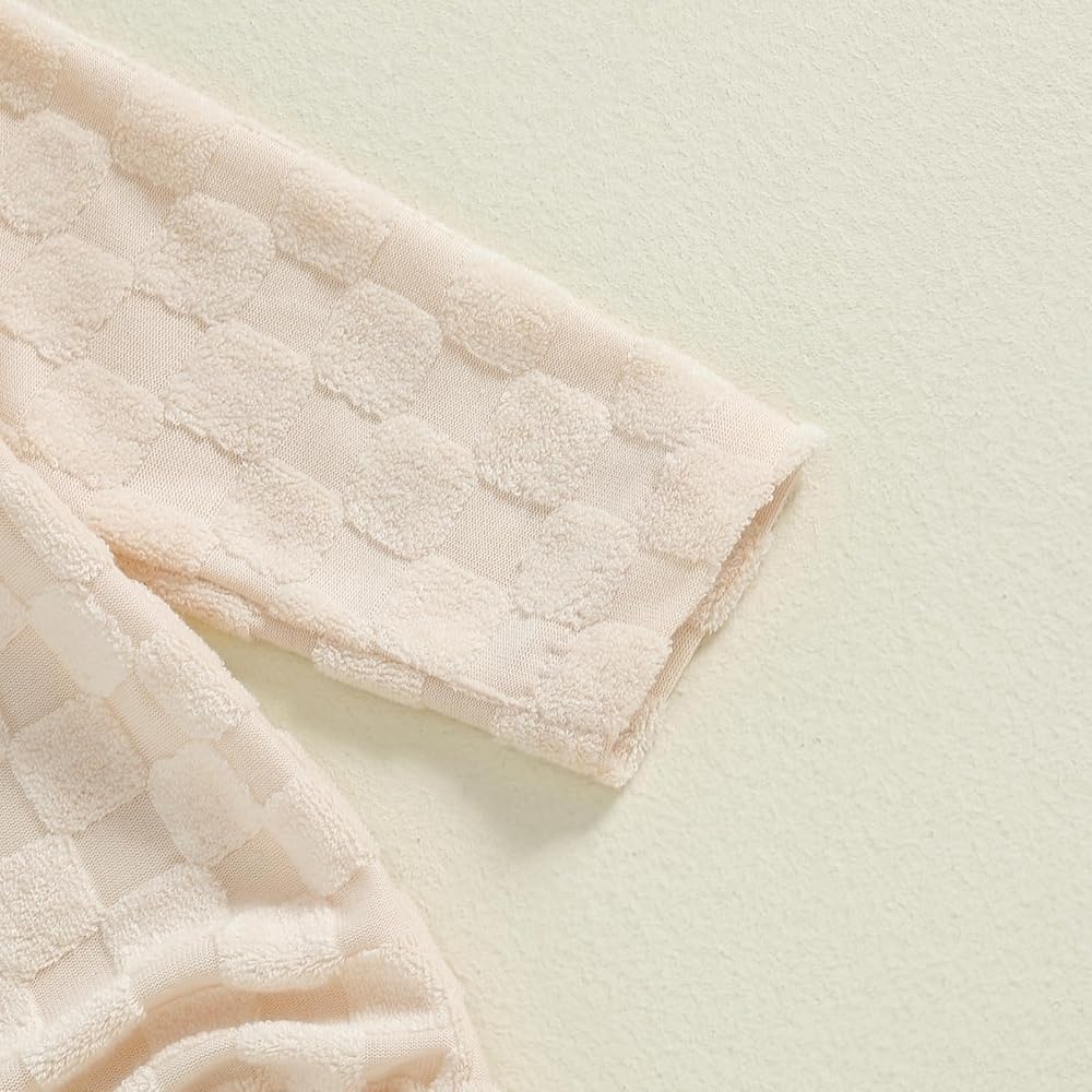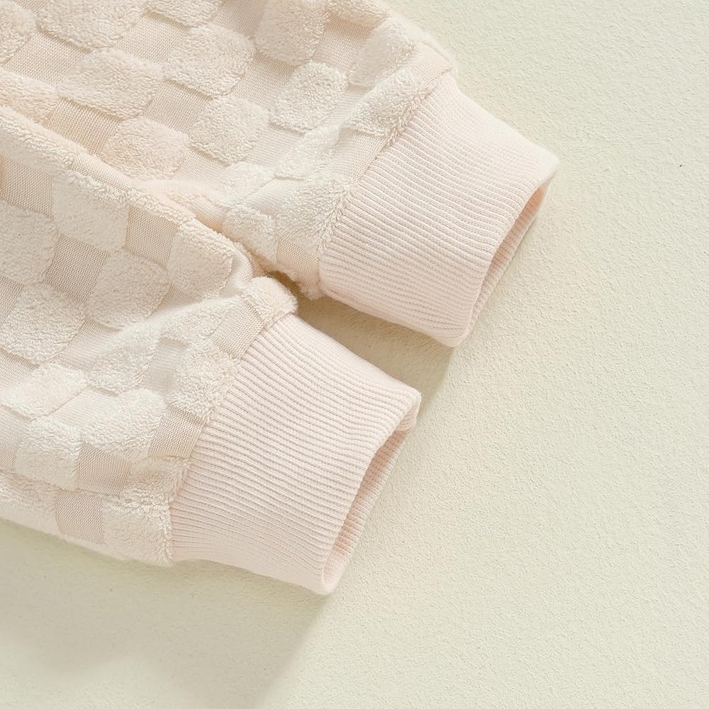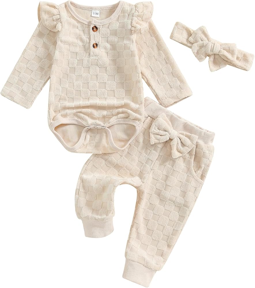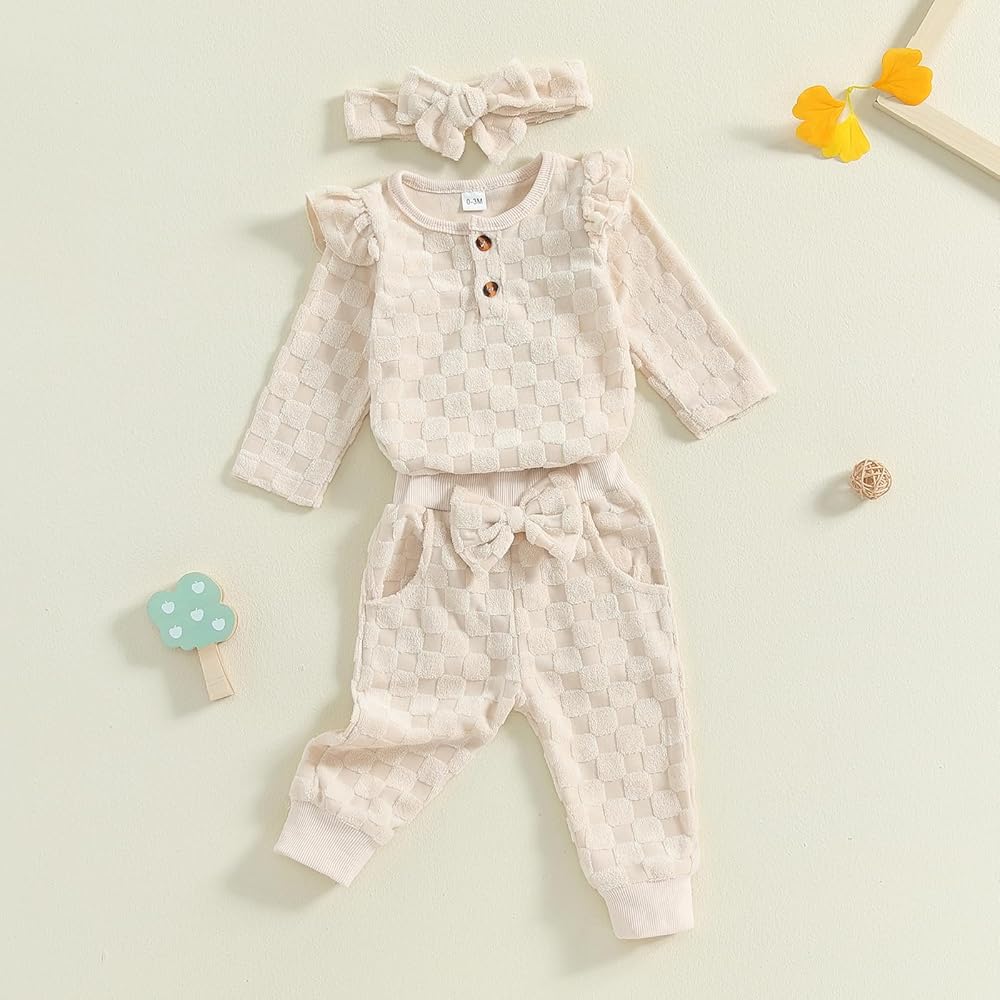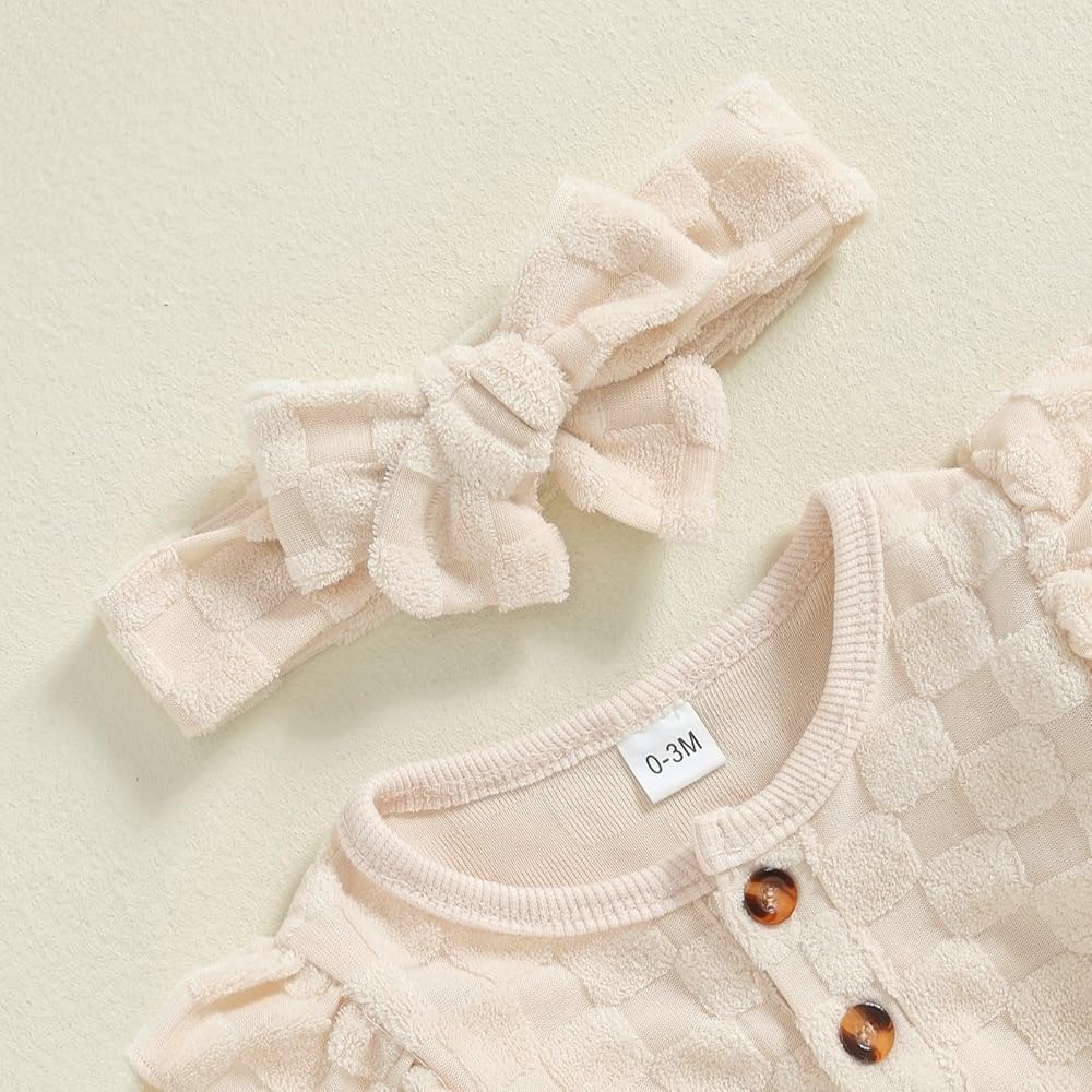 3-Piece Baby Girls Set Checkered Button Long Sleeve Round Neck Ruffled Romper Bow Long Pants Hair Band Outfits