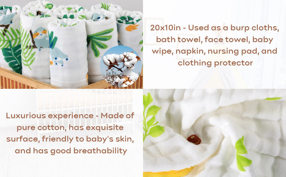 100% قطن الموسلين: مصنوعة من الموسلين بنسبة 100%، أفضل نسيج للأطفال، أقمشة التجشؤ هذه آمنة على بشرة طفلك الحساسة بلمسة لطيفة.