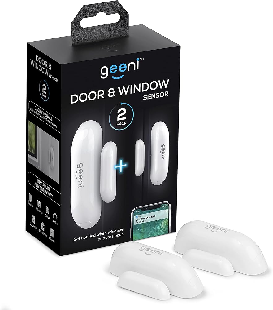 مستشعر دخول النوافذ والأبواب الذكي من Geeni - مراقب كاشف أمان المنزل ومنبه مع تنبيهات تطبيق هاتف بلوتوث، واي فاي لاسلكي متوافق مع Alexa وGoogle Home، لا يتطلب محورًا، عبوتان، أبيض