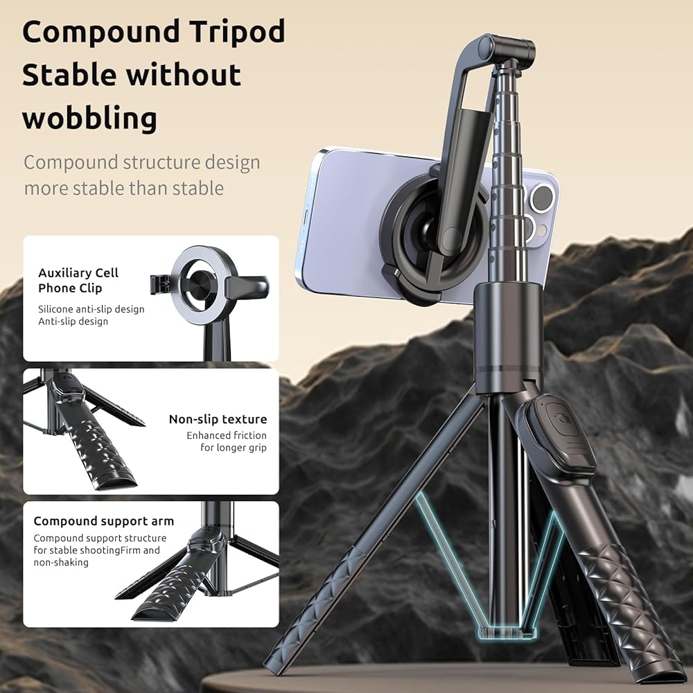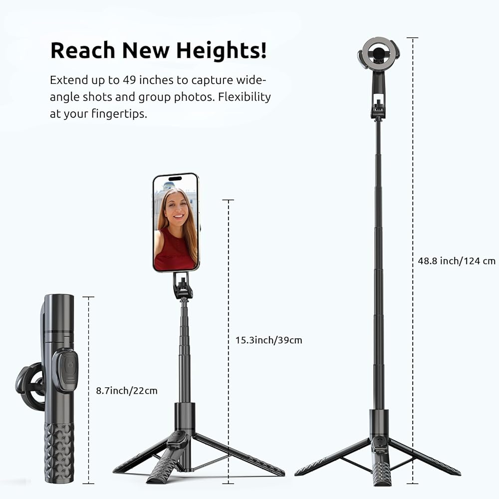 📏 قابلة للتمدد ومرنة: تمتد إلى 49 بوصة مع دوران 360 درجة؛ مثالية لزوايا التصوير المختلفة.