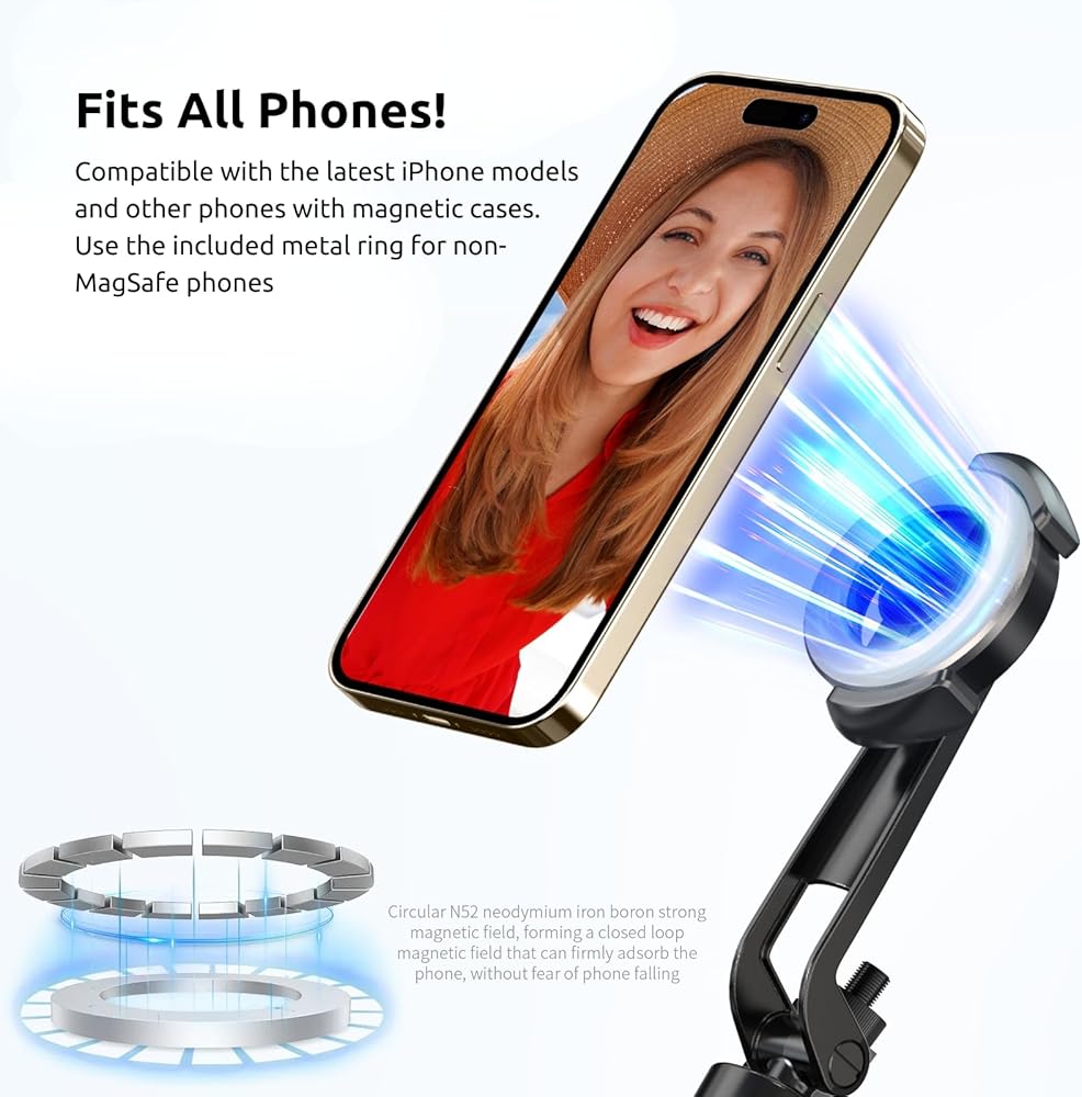 📱 متوافق مع جميع موديلات الهواتف: يعمل مع سلسلة iPhone 12/13/14، وiPhone 15 وما فوق، والهواتف الأخرى ذات الجرابات المغناطيسية. بالنسبة للهواتف غير المزودة بنظام MagSafe، استخدم الحلقة أو الحافظة المغناطيسية المرفقة.