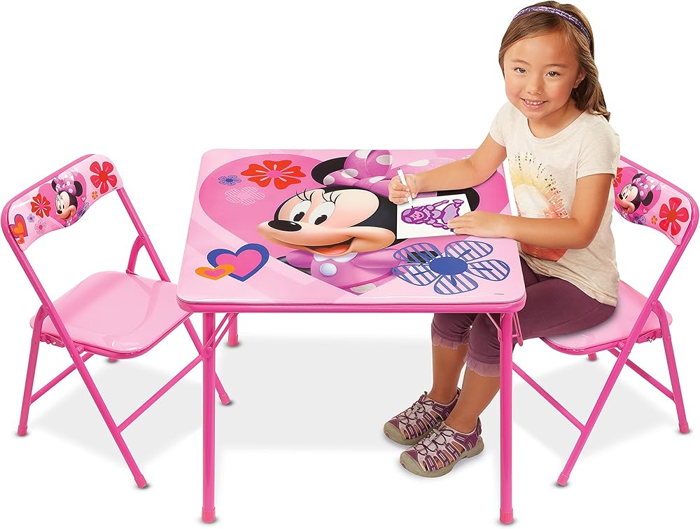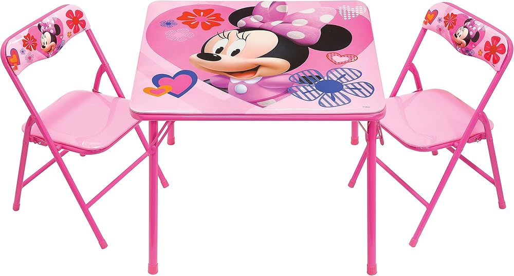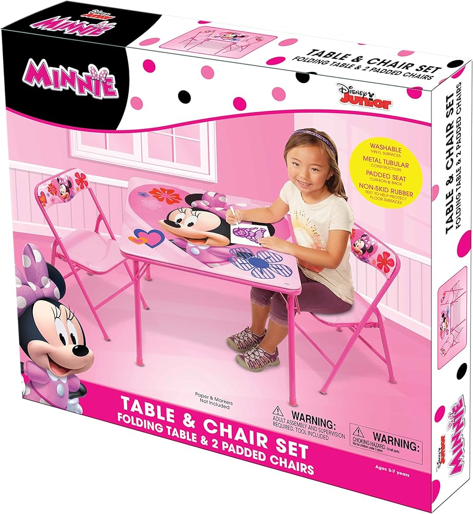 Now your child can have hours of fun with this Minnie Mouse activity Table set. The set comes with 1 24"x24" Table & 2 padded chairs. Bright colorful graphics & large table surface for drawing, eating & playing. Vinyl surface is washable. Made of sturdy metal tubular construction. Adult assembly required, tool included. Chairs include a safety locking mechanism. Chairs have a recommended weight limit of 70 lbs. Designed for ages 3+