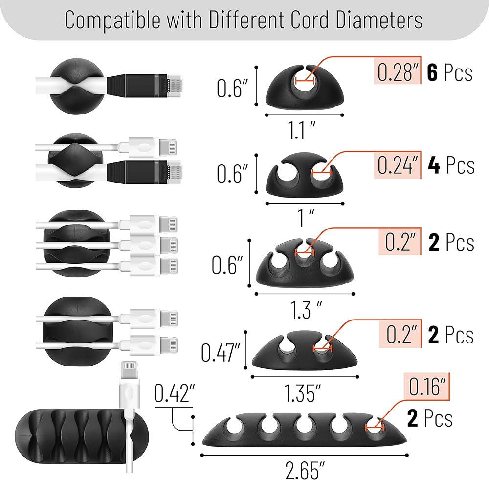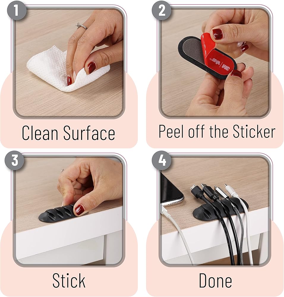 ما عليك سوى تقشير الجزء الخلفي ولصق مشابك السلك على سطح مستو وجاف دون أي براغي أو أدوات؛ ستنظم مشابك الكابلات الخاصة بنا أسلاكك الفوضوية بشكل أنيق.