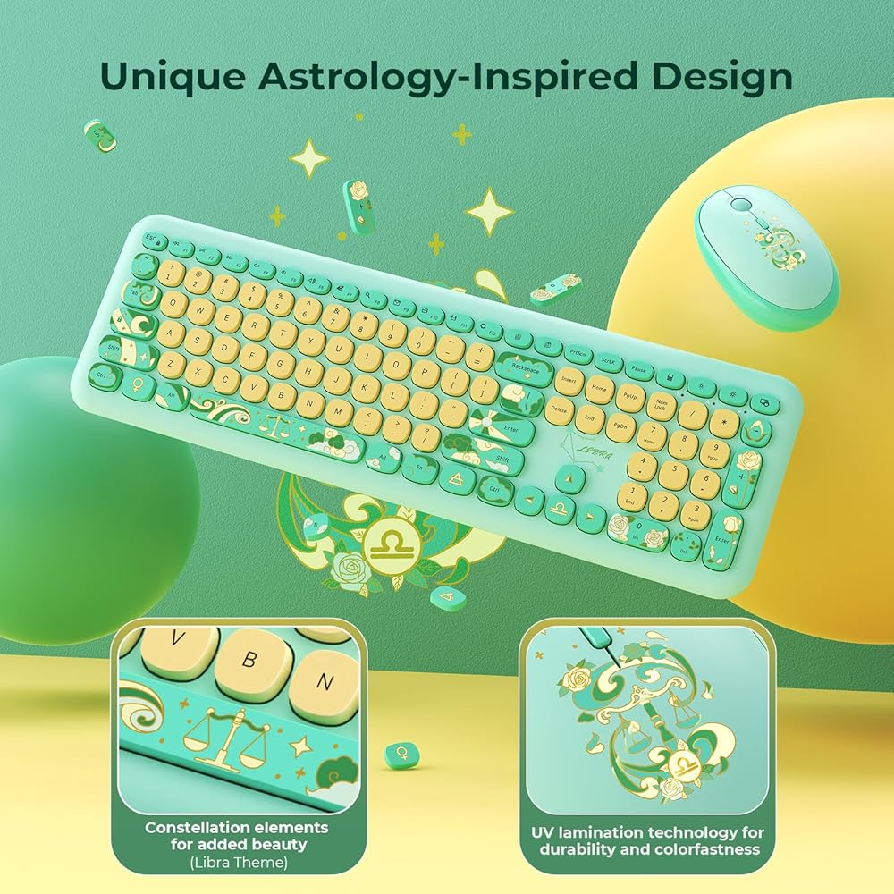 تصميم فريد مستوحى من علم التنجيم: تميز بمجموعة لوحة المفاتيح والماوس التي تتميز بأنماط كوكبة مصممة، يعكس كل منها خصائص العلامات. باستخدام تقنية الطباعة بالأشعة فوق البنفسجية المتقدمة، كن مطمئنًا أن البهتان هو مصدر قلق من الماضي، مما يضمن متانة طويلة الأمد