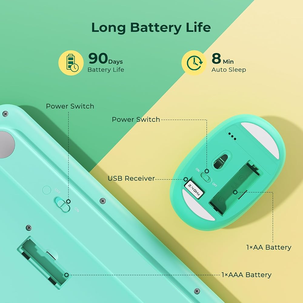 عمر بطارية طويل: تعمل لوحة المفاتيح اللاسلكية ببطارية AAA، بينما يستخدم الماوس بطارية AA (البطاريات غير متضمنة). ومع زمن انتظار يصل إلى 90 يومًا، يمكن للمستخدمين الاستمتاع بالاستخدام الممتد دون تغيير البطارية بشكل متكرر