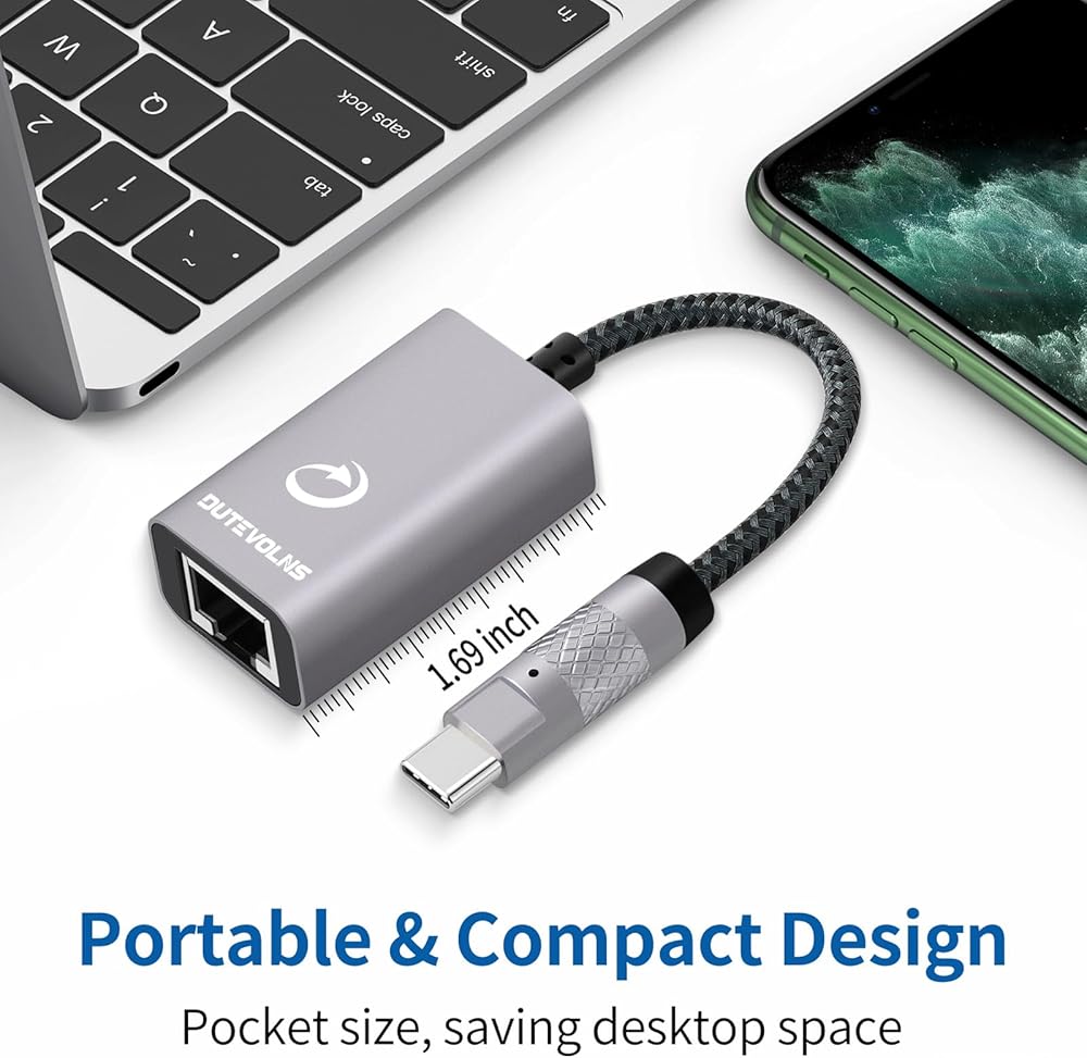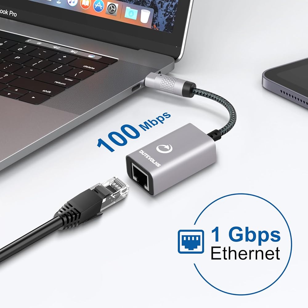 The Dutevolns Ethernet C-type network adapter Durable Connection - It is designed specifically for plug and play connectivity between USB-C devices and wired networks, providing 100 Mbps Ethernet connectivity even if wireless connections are inconsistent or overly extended. The high-quality aluminum shell design makes this USB C-to-RJ45 adapter durable.