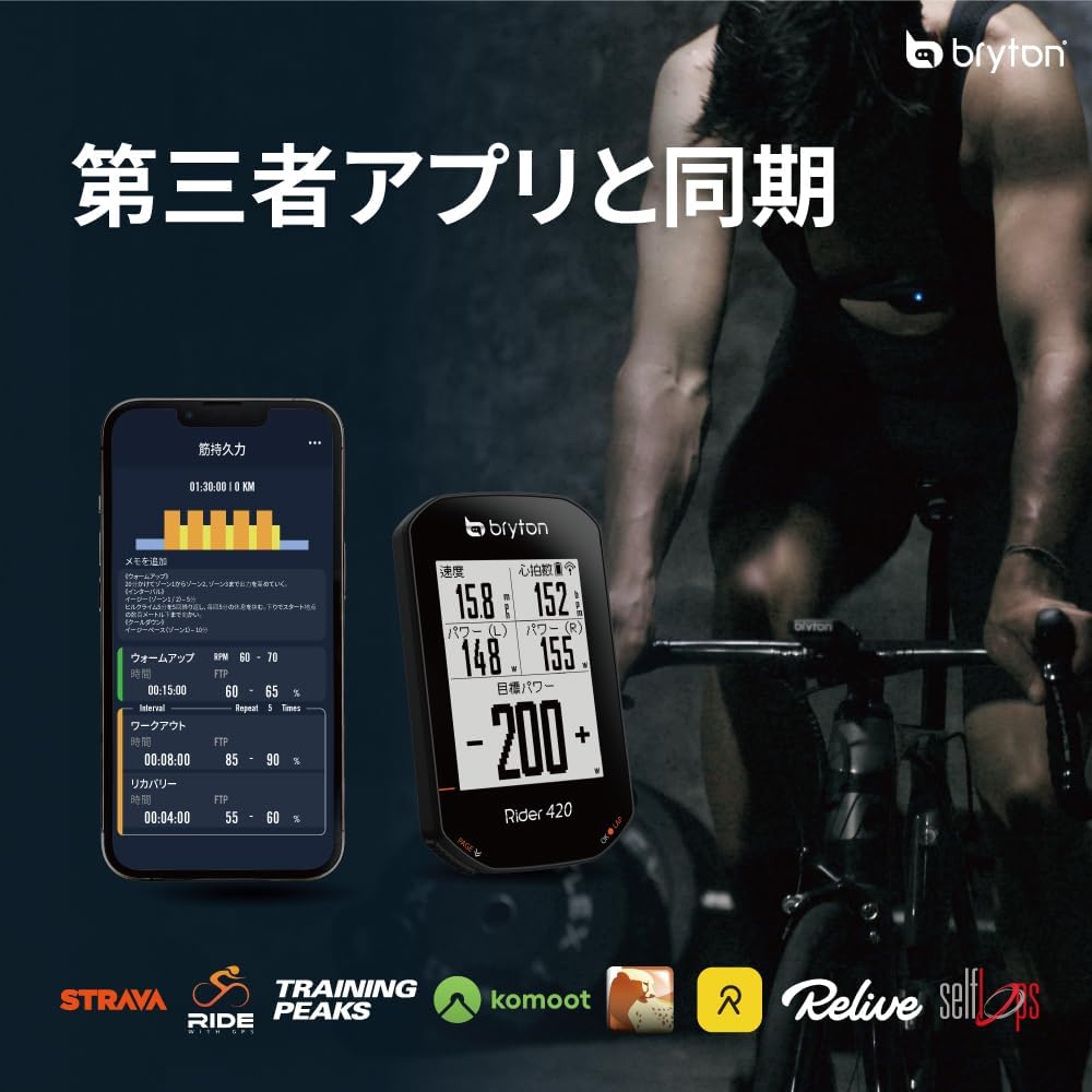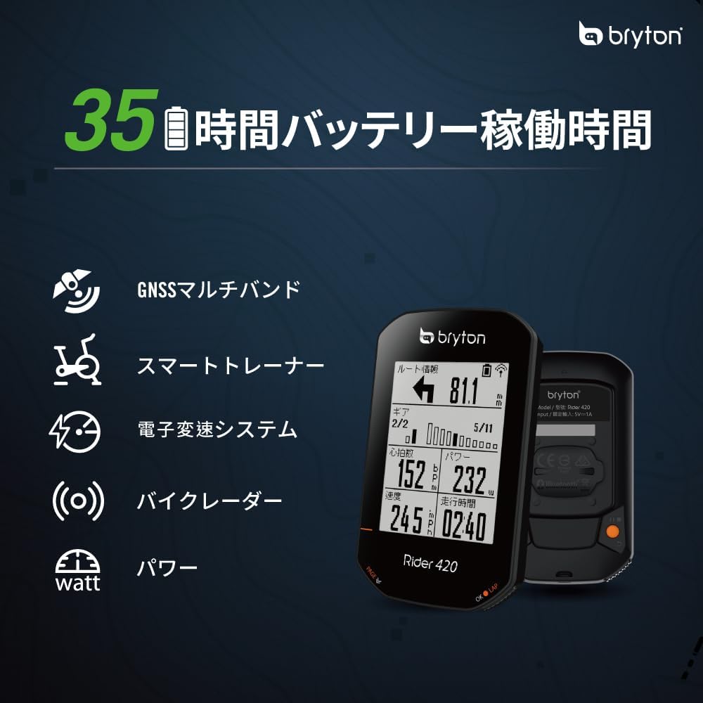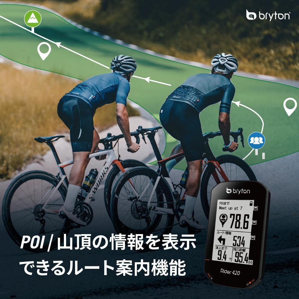 Bryton: If you re looking for a fully featured, simple to use GPS bike computer, then look no further that the Rider 420. With its Bluetooth ANT+ wireless connectivity, the Rider420 will pair with all major electronic shifting systems from Shimano Di2, Sram Etap/AXS Campagnolo EPS to clearly show gearing information and battery life too. Packed full of features including an advanced, high quality 3.2inch Mono LCD (Optically clear bonded screen), the Rider 420 will also help you train hard indoors with its ANT+ FE-C function allowing you to take control of your compatible indoor trainer. Change the screen layout by simply paring with the Bryton Active app and make changes in layout instantly. With the full global GNSS, the Rider420 will work where ever you take it, be that nationally or globally. Simple to set up is the follow the track / Turn by Turn navigation to help you find your way to or from you destination. Go anywhere, do anything all with the Rider420.The Rider 420 T bundle comes packaged with an additional Bluetooth/Ant+ Heart Rate Monitor Cadence sensor in the box.Features:Supports up to 80+ functions35 hours of battery life2.3 Inch Mono LCD (Optical Clear Adhesive Bonding)Smart Notifications (SMS, Calls Email)Supports Full GNSS (Global Satellites)BLE smart 5.0 (for quick and easy data transfer)Built in barometer for accurate altitudeAuto Altitude Calibration by GPSANT+/BLE dual band support for all sensorsPedal Power Meter compatibleHeart Rate Powermeter zonesElectronic Shifting supportANT+ FE-C Smart Indoor Trainer supportWorkouts Planning, TrainingPeaks Workout Auto SyncTrack Turn-by-turn NavigationDistance to next POI IndicationAutomatic upload to STRAVA / Relive /TrainingPeaks / Selfloops via Auto SyncIn the BoxRider 420 Main UnitANT+/BLE Smart Heart Rate MonitorANT+/BLE Smart Cadence SensorUSB CableBike MountSafety LanyardQuick Start GuideSimply PreciseEngineered with Simplicity and Convenience at its core, in order to create the most enjoyable cycling experience, the Rider 420 is built with 2.3 high quality optically bonded display, producing a crystal-clear view from any angle. Its follow track function with turn-by-turn makes exploring unfamiliar areas worry free, and by incorporating Full Global Navigation Satellite System (GNSS) support, the Rider 420 enables a faster satellite fix and guarantees more precise positioning and recording. It also provides maximum compatibility by working perfectly with both ANT+ and BLE sensors, making the Rider 420 a simple and precise GPS Cycle computer that is easy as start-and-go!Crystal Clear DisplayDesigned to create the best viewing experience, the Rider 420 is built with crisp black and white 2.3 large screen. The high quality optically bonded display provides crystal-clear reading from any angle and environment without interference. By simply looking at the cycling page, which can fit up to 8 data per page, it is possible to fully understand your real-time performance.Lead the Way
