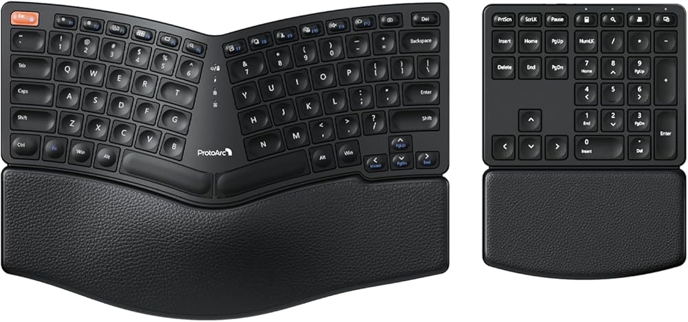 ProtoArc Ergonomic Wireless Keyboard, EK04 2.4GHz Ergo Wireless Keyboard, Split Design, Wrist Rest, Separate Numeric Keypad, Rechargeable, for Desktop, Laptop, PC, Windows OS