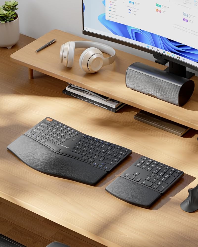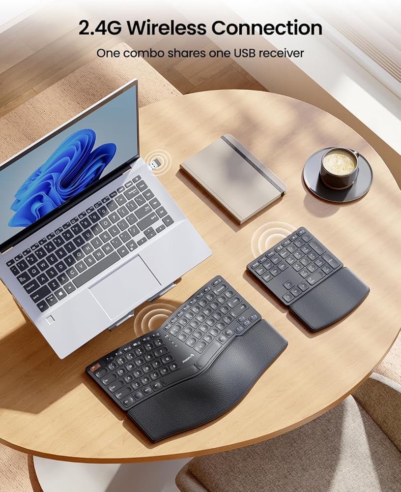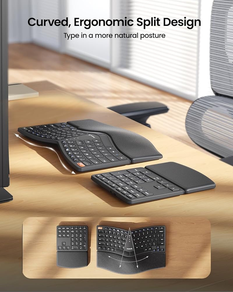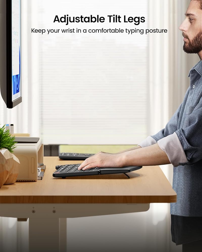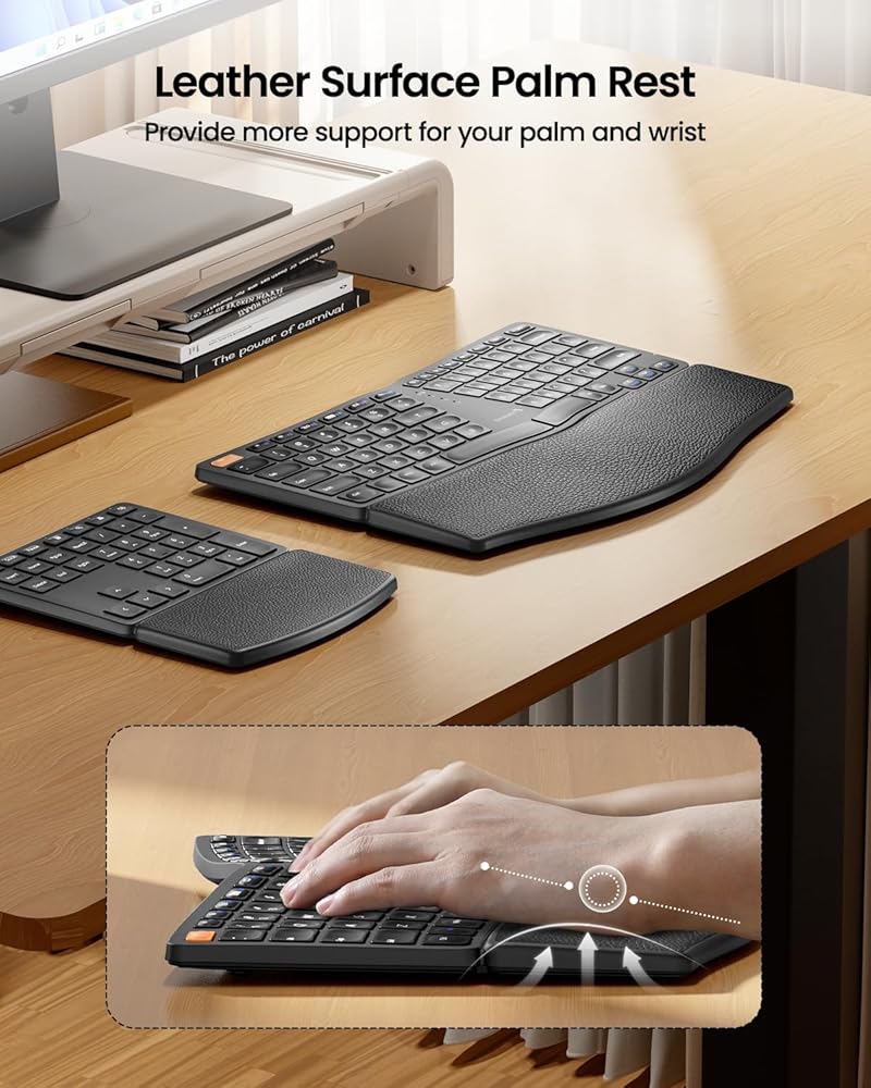Ergonomic Comfort Design: The wireless ergonomic keyboard features with curved and split keyset design, which helps to position your wrist and forearm in a more natural, relaxed posture. Curved wrist rest with leather surface offers typing comfort with more wrist support, less wrist bending compared to standard keyboard without wrist rest. Adjustable tilt legs position the keyboard at a perfect angle to keep your wrist relaxed and comfortable while typing.