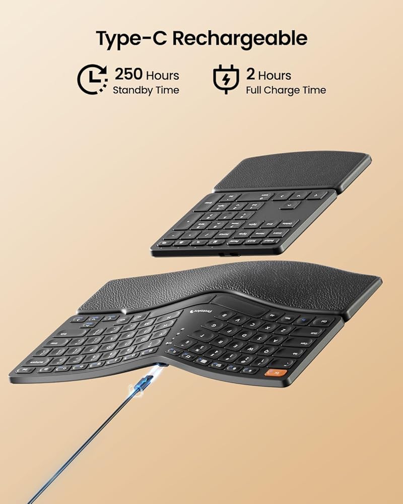 USB-C Charging: The ergonomic keyboard is built-in rechargeable lithium battery with 250 hours of standby time after 2 hours of full charge.