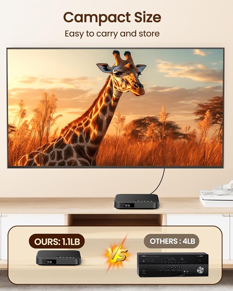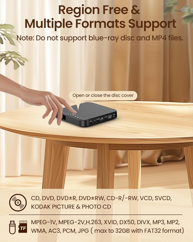 • 【مشغلات DVD للتلفزيون】تم تصميم مشغل DVD الصغير هذا ليكون خفيف الوزن وقابل للحمل. فقط 6.1*5.9*1.2 بوصة - الوزن: 1.1 رطل. التصميم الصغير مثالي للمساحات الصغيرة والأنماط البسيطة وغرف النوم والسفر. جهاز التحكم عن بعد المتضمن يجعل من السهل التنقل بين القوائم والتحكم في التشغيل دون النهوض من الأريكة. توجد أزرار متعددة في الجزء العلوي من مشغل DVD للتشغيل لمنع نسيان إحضار جهاز التحكم عن بعد عند الخروج.
