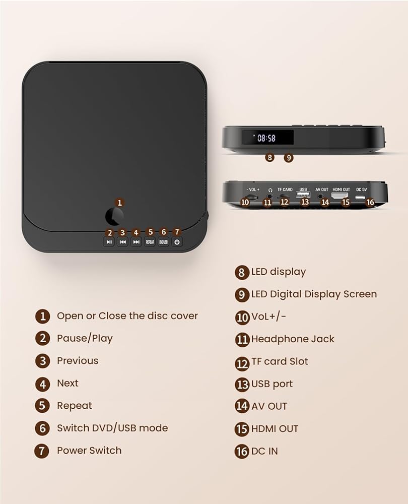 مشغلات DVD للتلفزيون مع HDMI - مشغل DVD صغير من DESOBRY للتلفزيون الذكي، مشغل DVD صغير يشغل جميع المناطق والأشكال، يدعم فيديو 1080 بكسل، مخرج AV، مدخل بطاقة USB/TF، مدمج PAL/NTSC