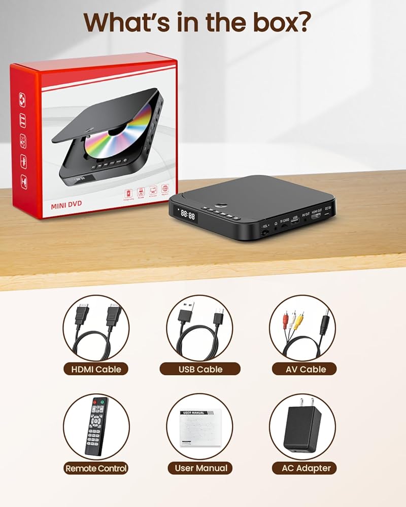 • 【ما الذي يمكنك الحصول عليه 】يمكنك الحصول على: 1 × مشغل DVD صغير الحجم، 1 × كابل HDMI، 1 × كابل RCA، 1 × كابل USB، 1 × جهاز تحكم عن بعد، 1 × محول، 1 × دليل المستخدم. ضمان ما بعد البيع لدينا: ضمان لمدة عام وصيانة مدى الحياة، لا داعي للقلق بشأن أي مشكلات، وسوف نقدم لك دعمًا احترافيًا وشاملاً وعناية.