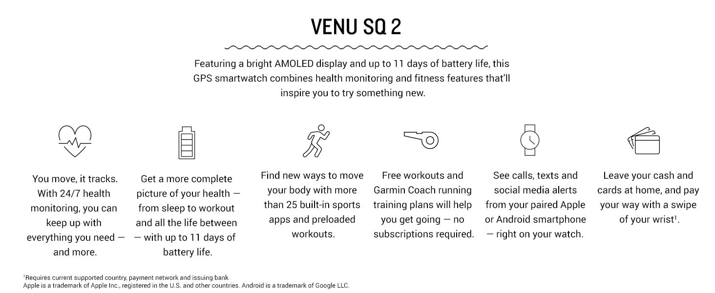 • في العلبة: 1x Garmin Venu Sq 2 Smartwatches Cool Mint، 1x كابل شحن/بيانات، 1x Wearable4U E-Bank (wa001)