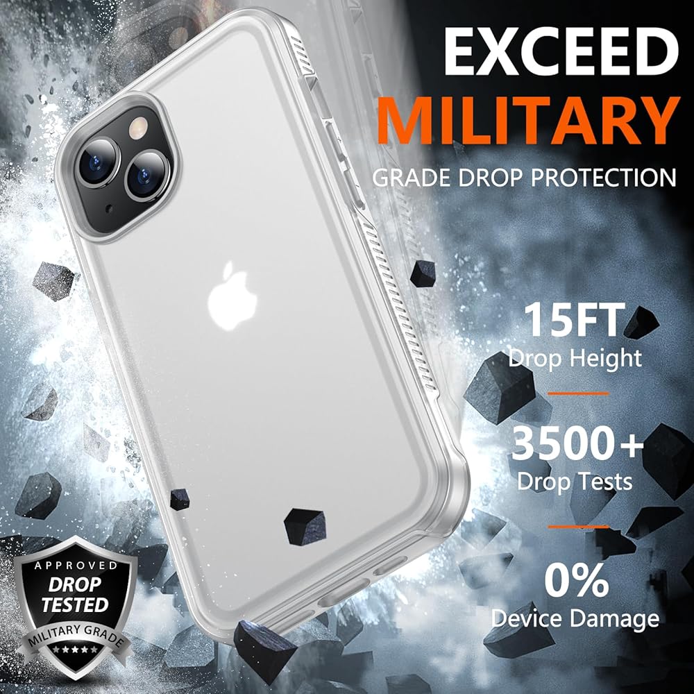 [Thorough Screen & Camera Lens Protection]: Raised lips protecting iPhone 14/iPhone 15 screen and camera lens thoroughly. 1.5mm raised lips over screen and 1.5mm raised lips over camera relieves impact and protects the iPhone screen and camera against drop damage, cracks and scratches. Reinforced corner effectively absorb bumps from any angle drop.