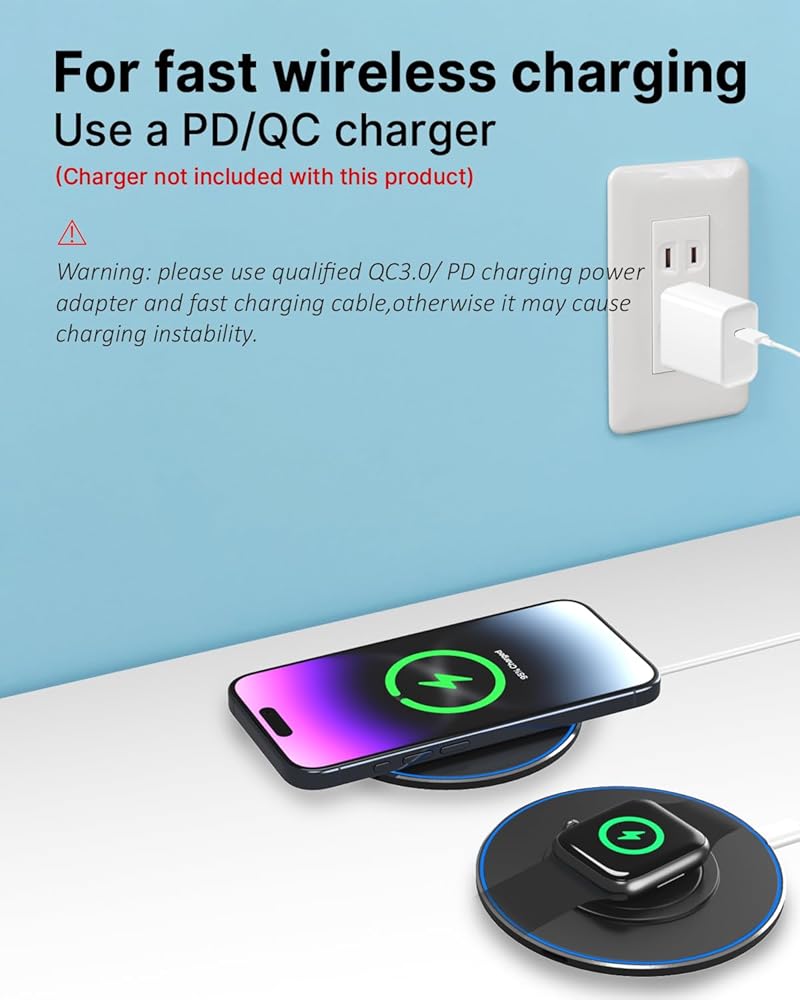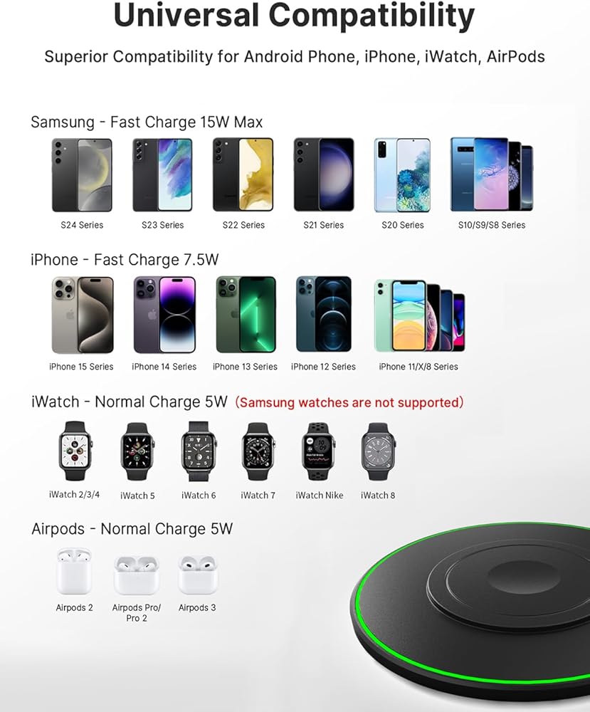 توافق واسع النطاق للشاحن اللاسلكي: وضع شحن 15 واط لهاتف iPhone 15/14/ 13 /12/SE/11/XS MAX/X/8، وضع شحن 10 واط لهاتف Samsung Galaxy S22/S21/S20/S10/S10+/S10e/Note 20/10+/9/8/5؛ شحن 7.5 وات لهاتف LG V50 ThinQ/V50/V40/V35/V30، G7/G8، Huawei Mate 20 Pro/P30 Pro/P40 Pro؛ شاحن 5 واط لأجهزة Apple iWatch/ AirPods 2/AirPods Pro/Galaxy Buds+ ومتوافق مع جميع الهواتف التي تدعم الشحن اللاسلكي. (ملاحظة: المحول غير متضمن، يلزم محول QC3.0 للشحن السريع.)