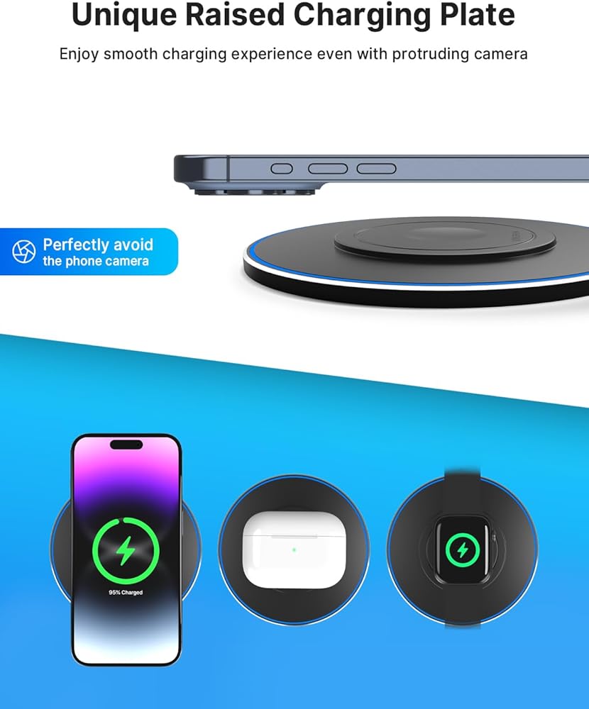 【محطة شحن رفيعة للغاية ومحمولة】محطة الشحن اللاسلكية 3 في 1 يبلغ سمكها 0.3 بوصة فقط، وقطرها 3.9 بوصة، وتزن 1.7 أونصة، وسهلة وضعها في جيبك، ووسادة الشحن اللاسلكية تجعل من السهل حملها أثناء السفر أو العمل، استخدام مثالي للمكتب والمنزل. تتيح كابلات النوع c (المضمنة) للشاحن اللاسلكي الشحن بمعدل أسرع
