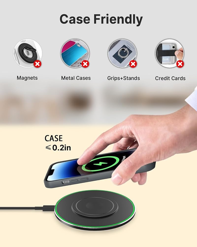 【أكثر أمانًا وأسهل في الاستخدام】لوحة شاحن لاسلكية بقدرة 15 وات، مادة سبائك الألومنيوم، تبديد سريع للحرارة أثناء الشحن، توفر تقنية الحماية الذكية التحكم في درجة الحرارة، وحماية من التيار الزائد، وحماية من الجهد الزائد وحماية من الشحن الزائد. شحن أكثر أمانًا، يبدو رائعًا وخفيف الوزن ووسادة مطاطية أنيقة غير قابلة للانزلاق وكفاءة شحن أعلى، للحصول على تجربة أفضل، نود منك خلع حافظة الهاتف واستخدام المحولات الموصى بها (غير متضمنة)