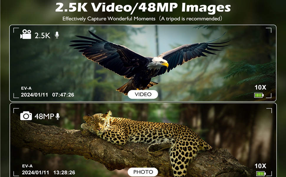 • مناظير رقمية عالية الدقة - مناظير شاشة LCD مقاس 2.4 بوصة مع كاميرا 48 ميجابكسل، تكبير بصري 12x، تكبير رقمي 10X، مقاطع فيديو 2.5K تجمع بين نظام مجهر بصري ممتاز ووظيفة فيديو رقمية عالية الدقة. دعم التقاط الصور وتصوير الفيديو بدقة 1280 × 1080. 5.7 بوصة × 3.8 بوصة × 2.5 بوصة (17 أونصة).