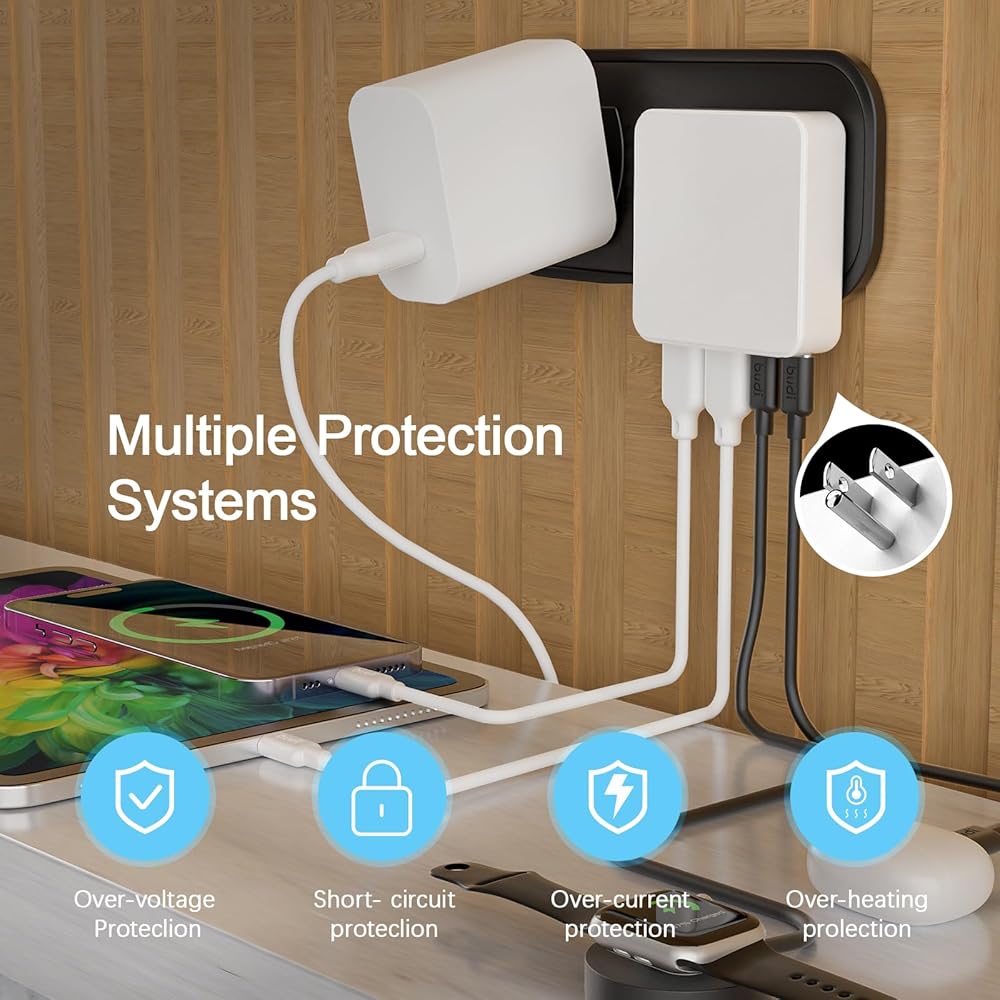 • شحن USB-C آمن وموثوق به: تحتوي كتلة شاحن USB C ذات 4 منافذ بقدرة 34 وات على نظام أمان متعدد الحماية يحمي أجهزتك من التيار الزائد والجهد الزائد والدائرة القصيرة وارتفاع درجة الحرارة، مما يضمن سلامة شحن جهازك وطول العمر.