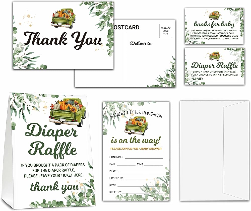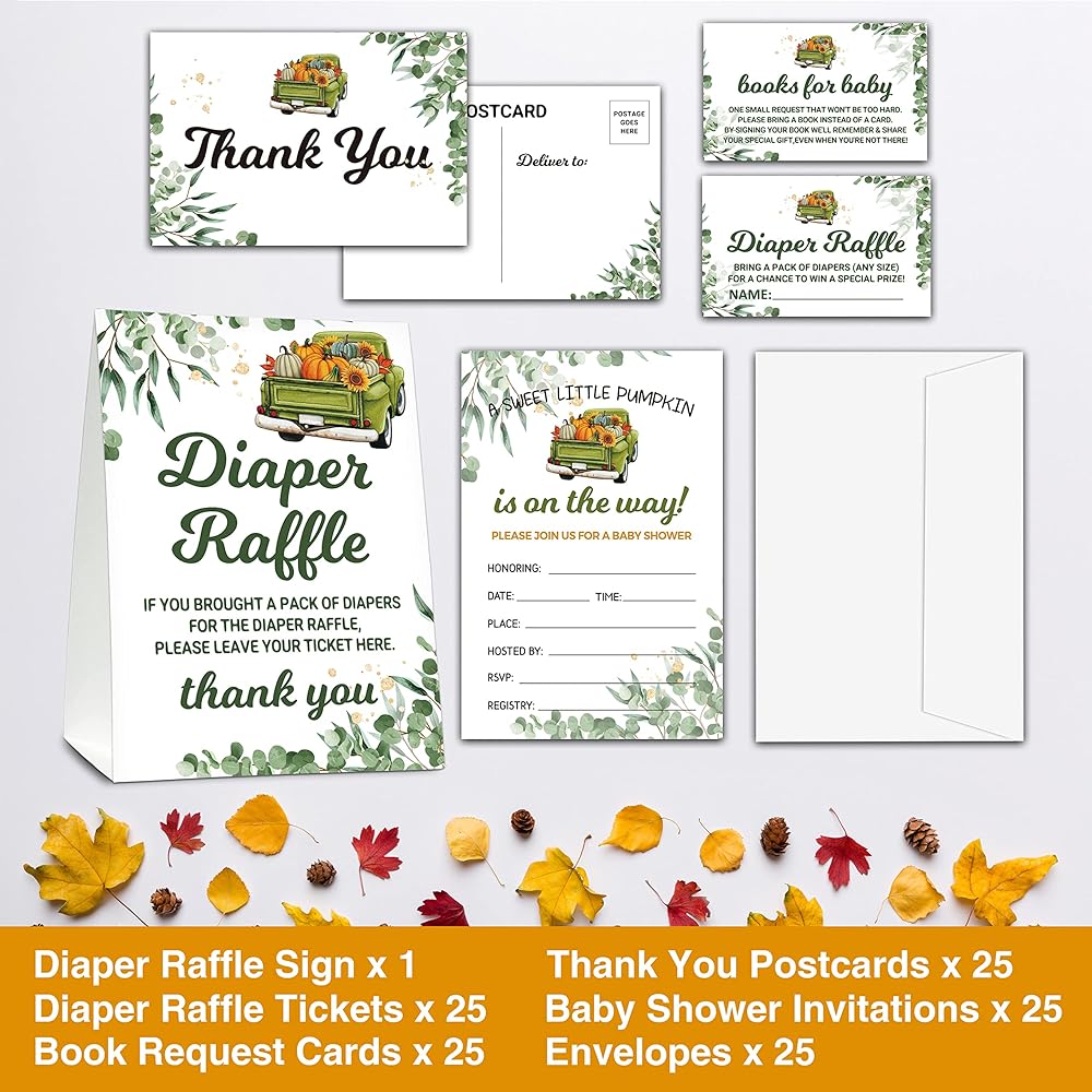 مجموعة دعوات استحمام الطفل لعيد الشكر في الخريف - ديكورات استحمام الطفل الخضراء - شاحنة اليقطين 1 لافتة يانصيب للحفاضات و25 تذكرة يانصيب للحفاضات، 25 بطاقة طلب كتاب، 25 بطاقة بريدية شكرًا لك، 25 دعوة مملوءة بالأظرف (03)